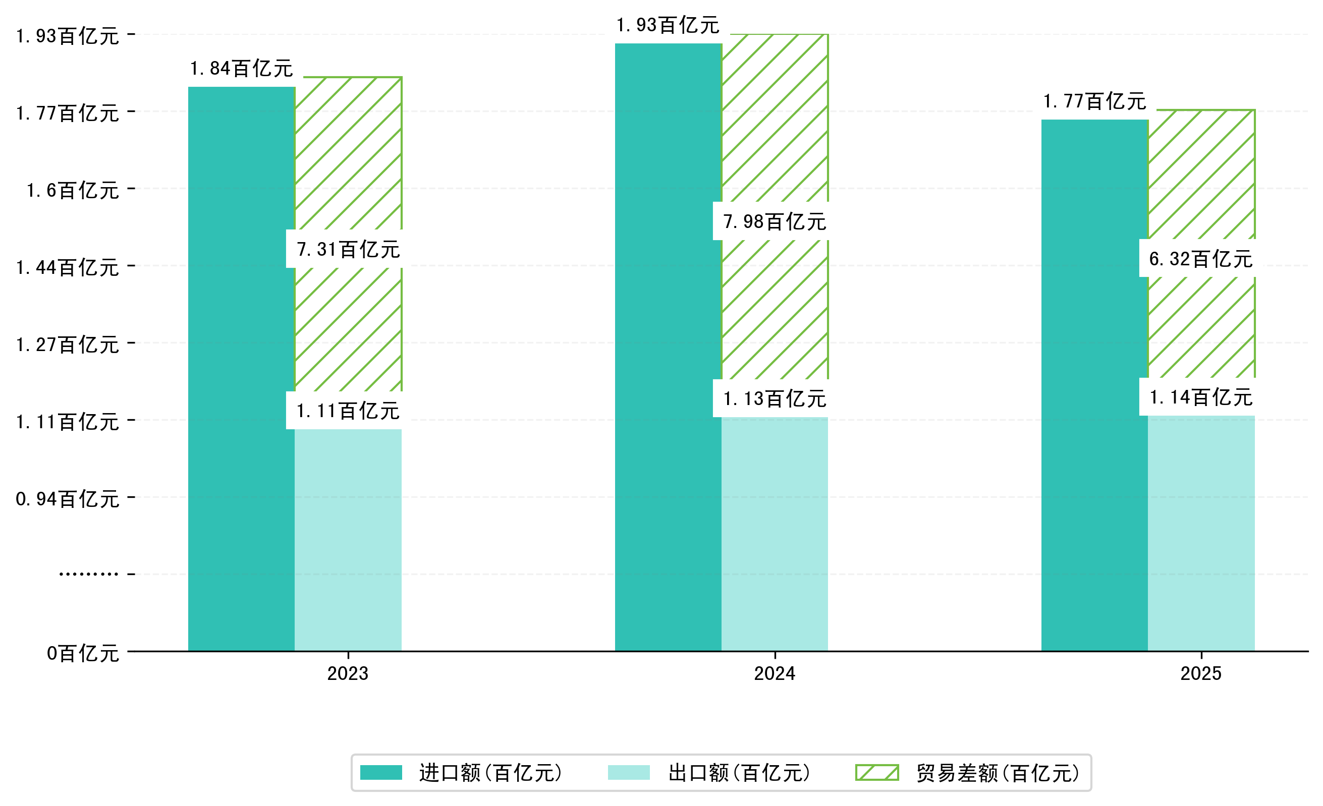 以人民币计,2025年2月内蒙古自治区贸易差额为36,8018,9110万元(贸易逆差),相比上月减少了10,4220,4744万元,即1,4629,5581万美元;相比上年同期增加了10,5202,4969万元,同比增加-22.23%。
