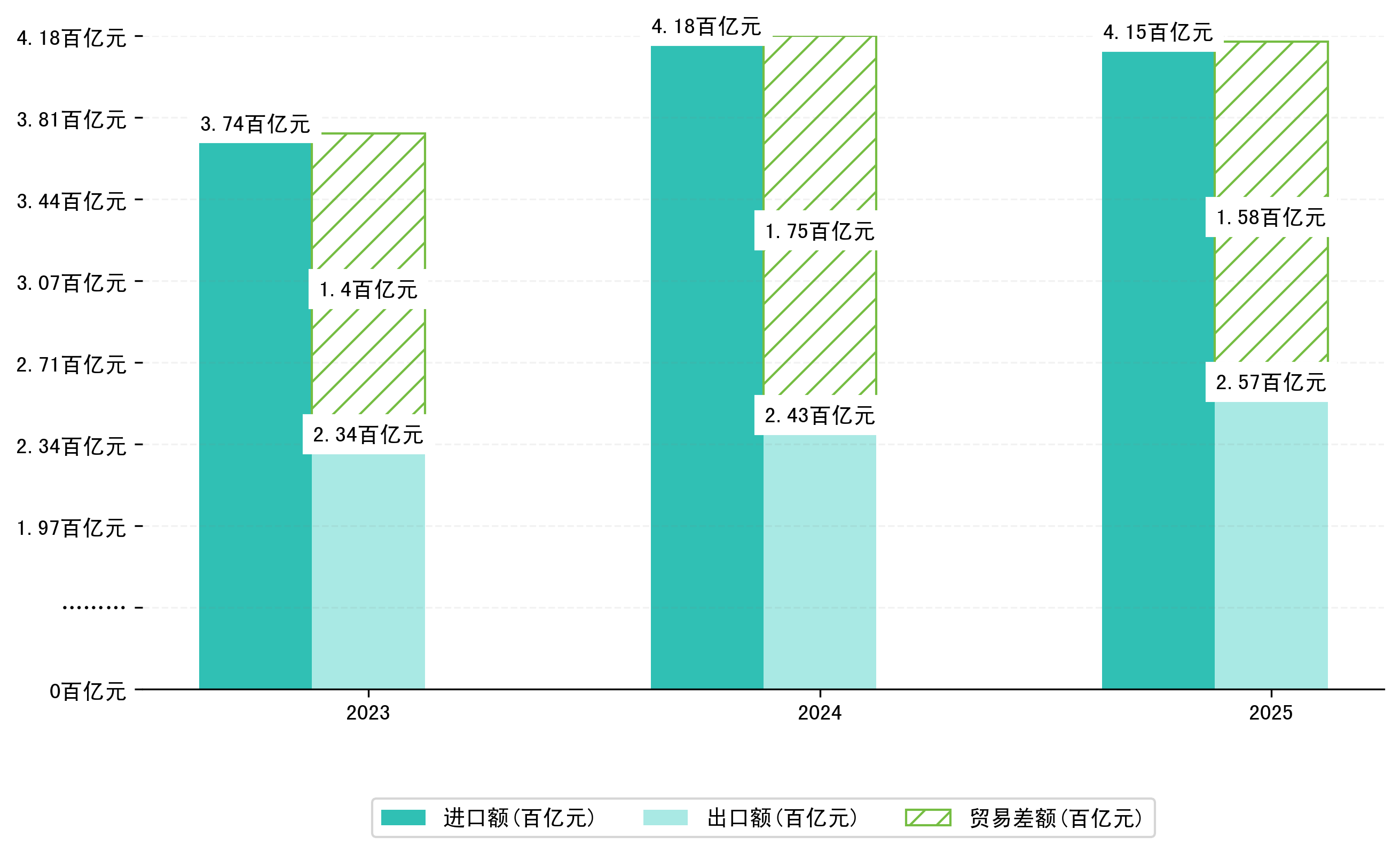 以人民币计,2025年4月内蒙古自治区贸易差额为56,1910,7770万元(贸易逆差),相比上月减少了17,6571,7748万元,即2,4512,4836万美元;相比上年同期减少了3,6671,6860万元,同比减少6.98%。