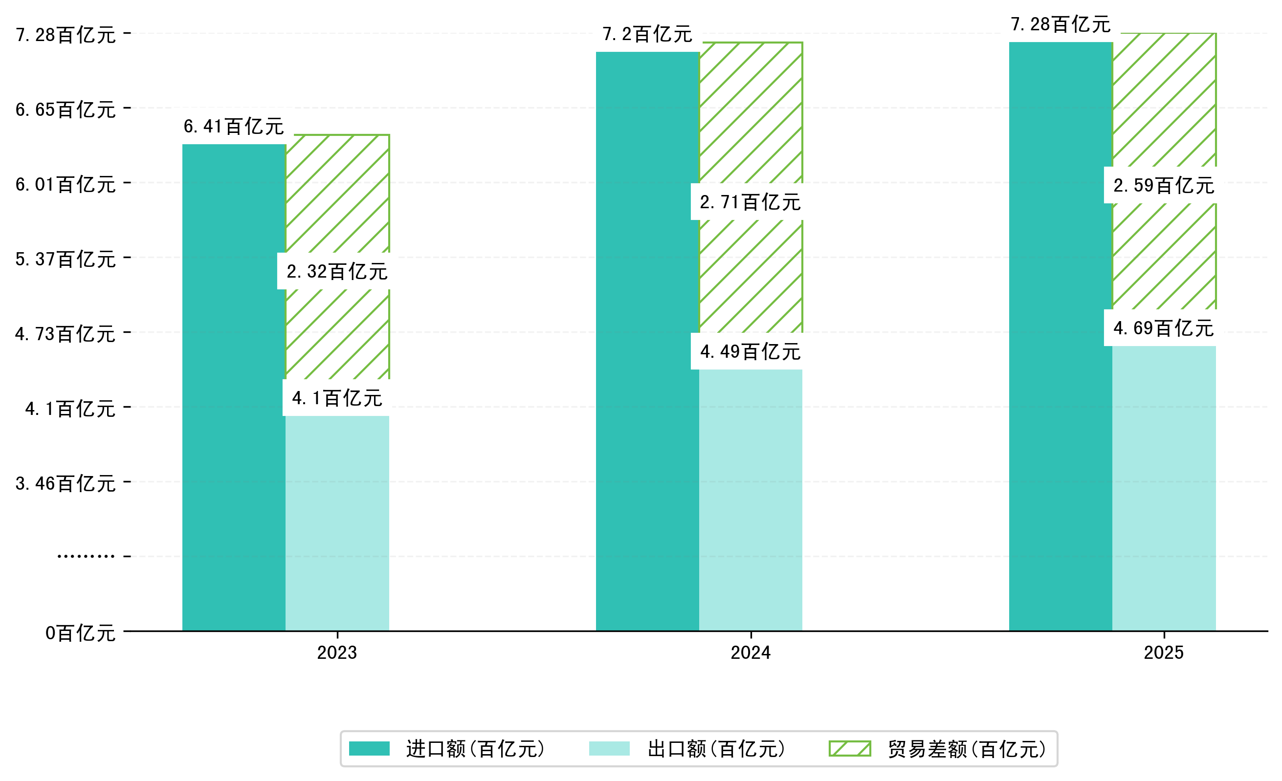以人民币计,2025年7月内蒙古自治区贸易差额为36,9049,6515万元(贸易逆差),相比上月减少了2,6672,0987万元,即3751,6984万美元;相比上年同期减少了2,5521,1189万元,同比减少7.43%。