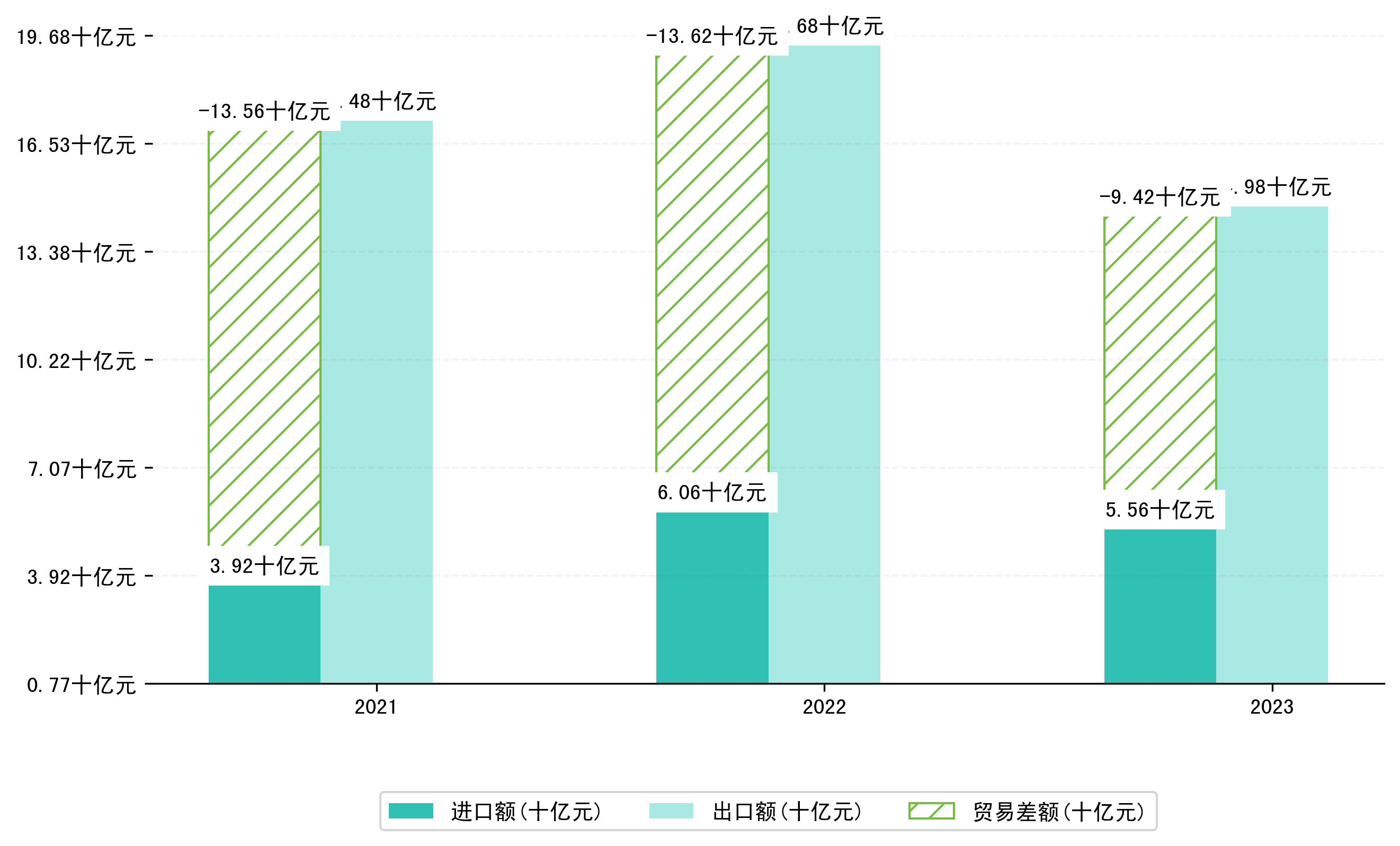 以人民币计,2023年12月宁夏回族自治区贸易差额为6,1378,2463万元(贸易顺差),相比上月减少了2,7122,1421万元,即3776,7511万美元;相比上年同期减少了4,0047,3338万元,同比减少-39.48%。
