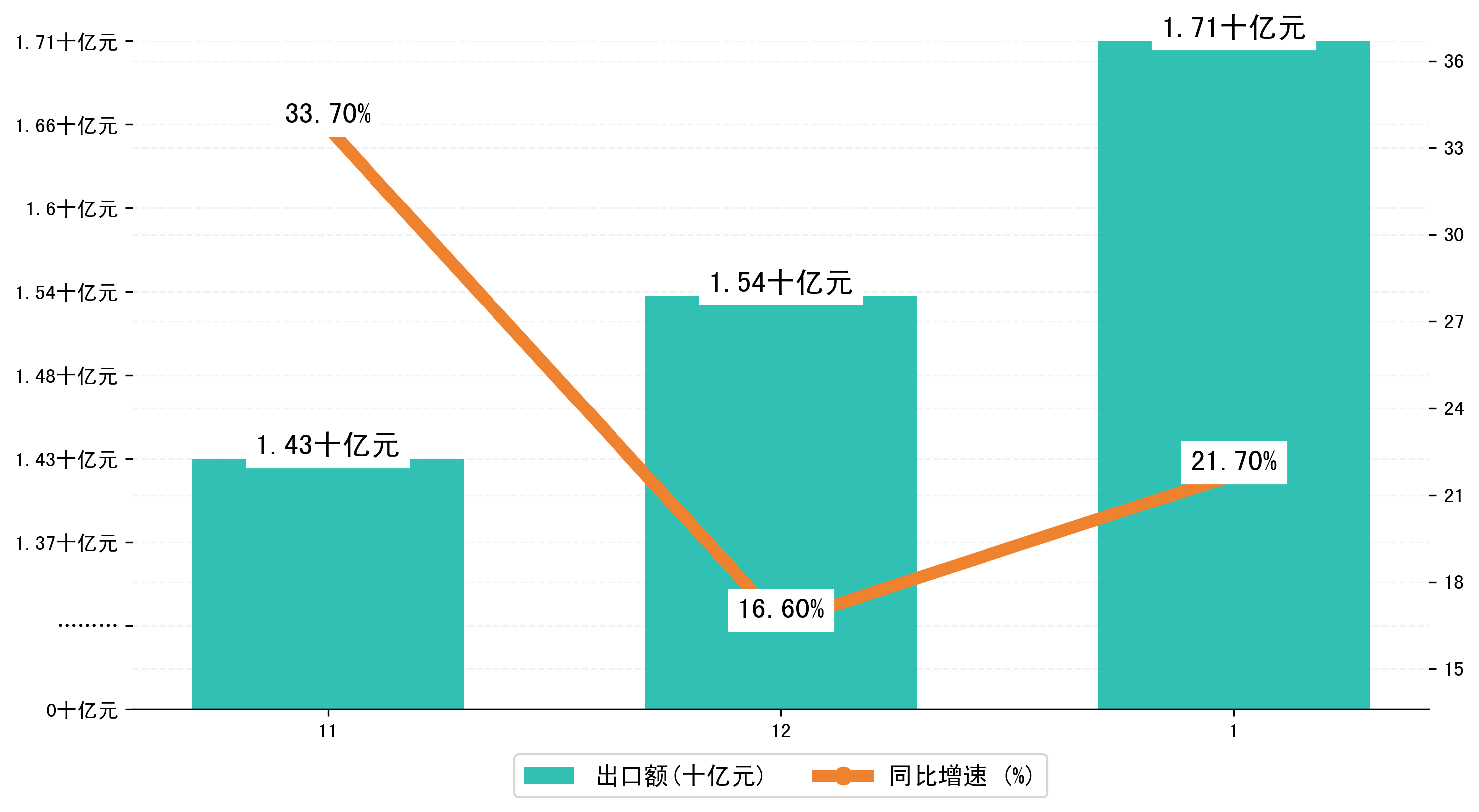 以人民币计,2023年1-1月宁夏回族自治区出口额为17,1338.1907万元,相比上年同期增加了2,5116.4657万元,同比增加了21.70%。