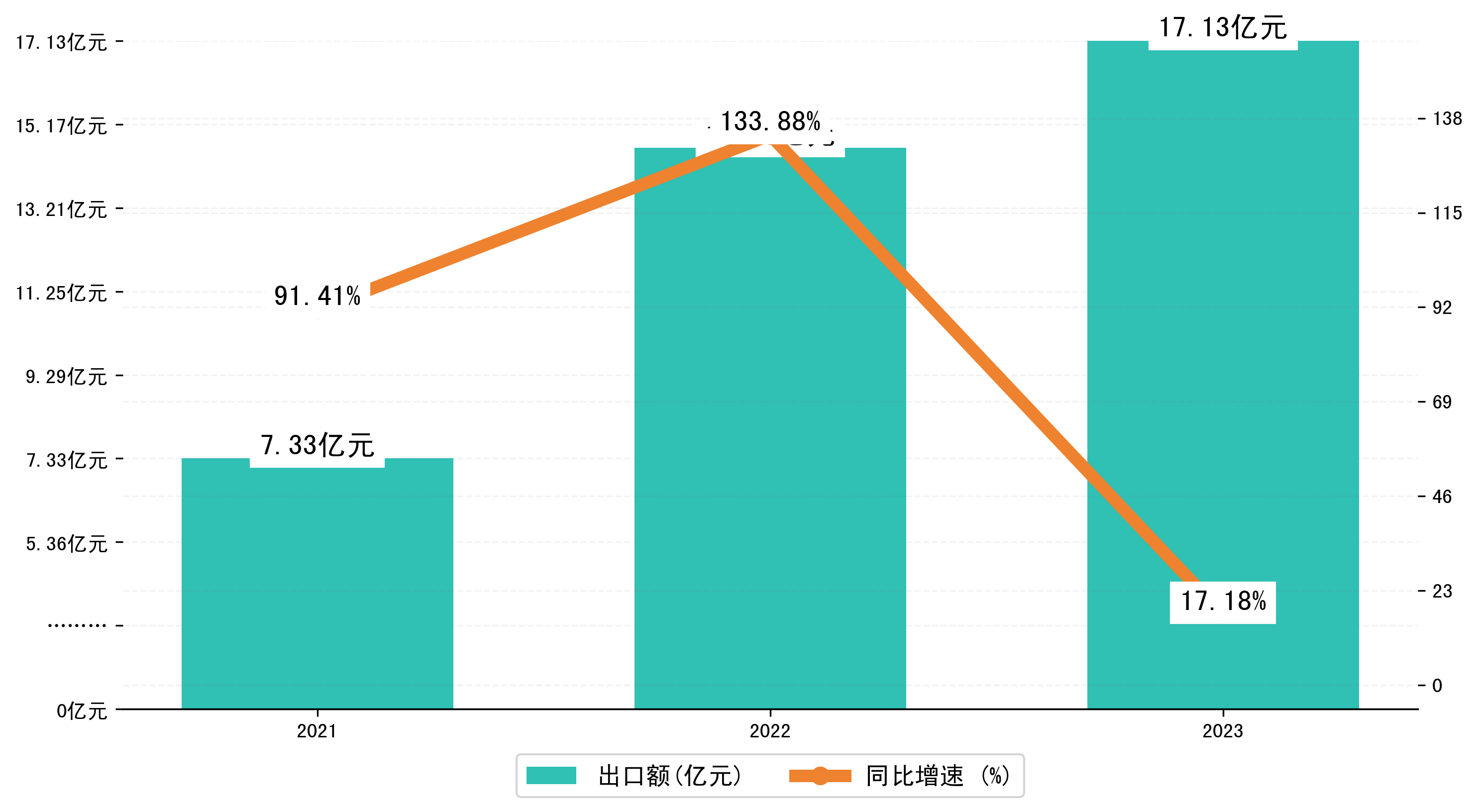 以人民币计,2023年1月宁夏回族自治区出口额为17,1338.1907万元,相比上月增加了1,7571.5907万元;相比上年同期增加了2,5116.4657万元,同比增加了21.70%。