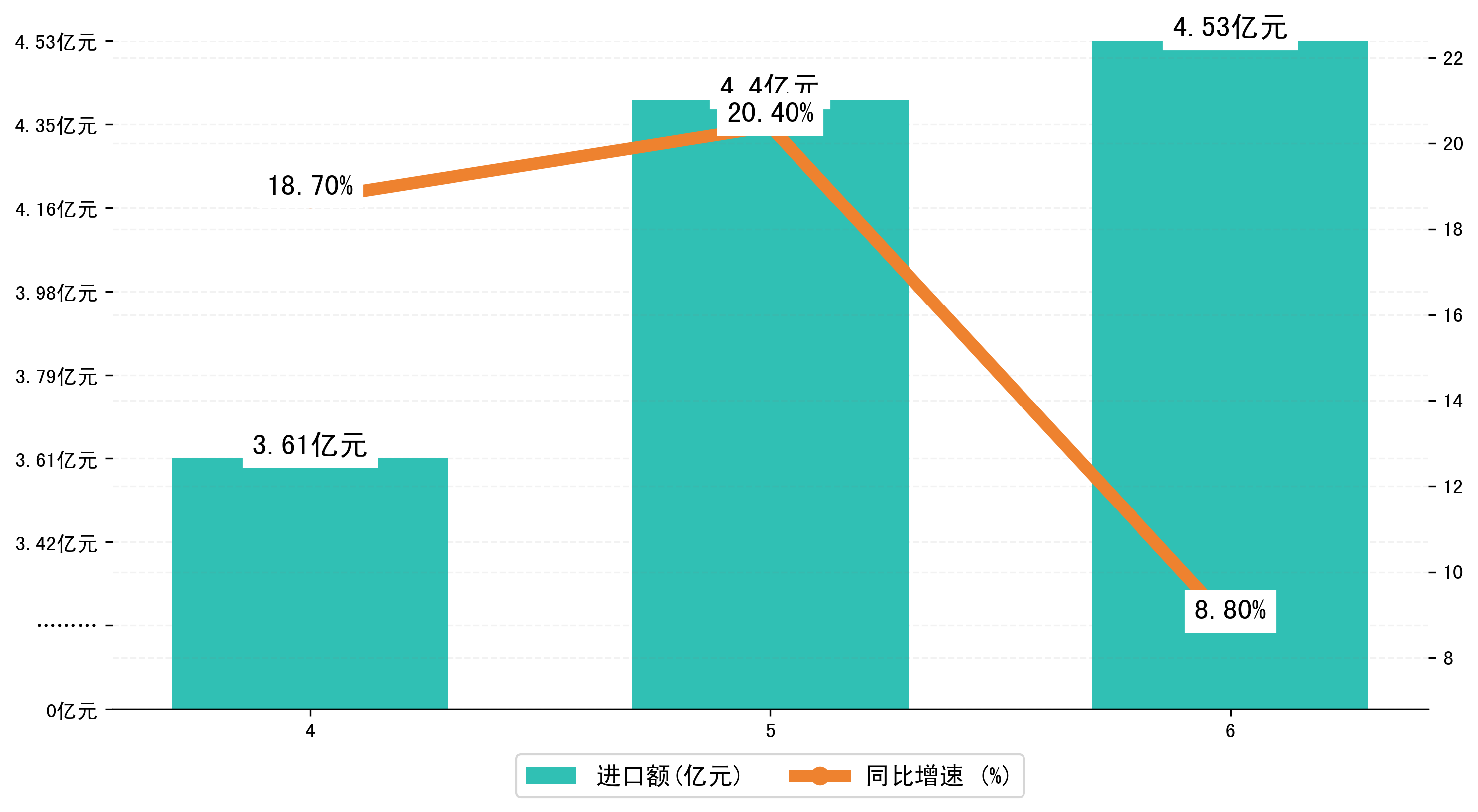 以美元计,2023年1-6月宁夏回族自治区进口额为3,3867.505万美元,相比上年同期增加了456.2208万美元,同比增加1.40%。