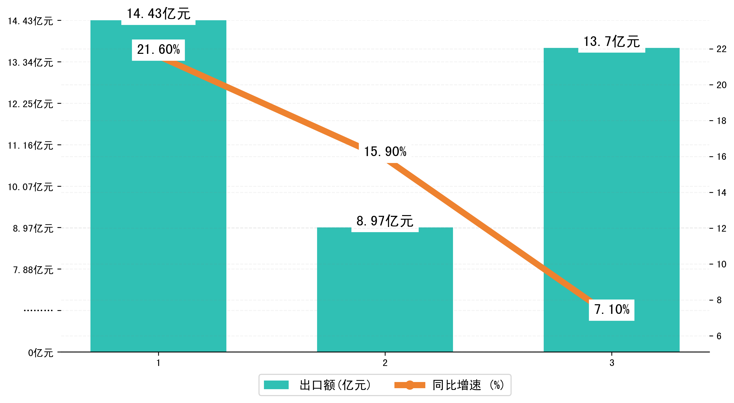 以美元计,2025年1-3月宁夏回族自治区出口额为5,1607.6488万美元,相比上年同期增加了2832.0443万美元,同比增加6.00%。