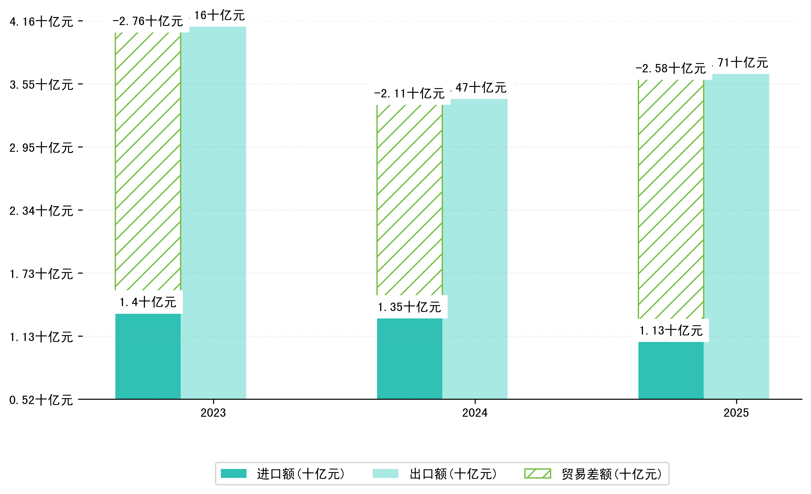 以美元计,2025年1-3月宁夏回族自治区贸易差额为3,5896,0657万美元(贸易顺差),相比上年同期增加了6156,5960万美元,同比增加20.7%。