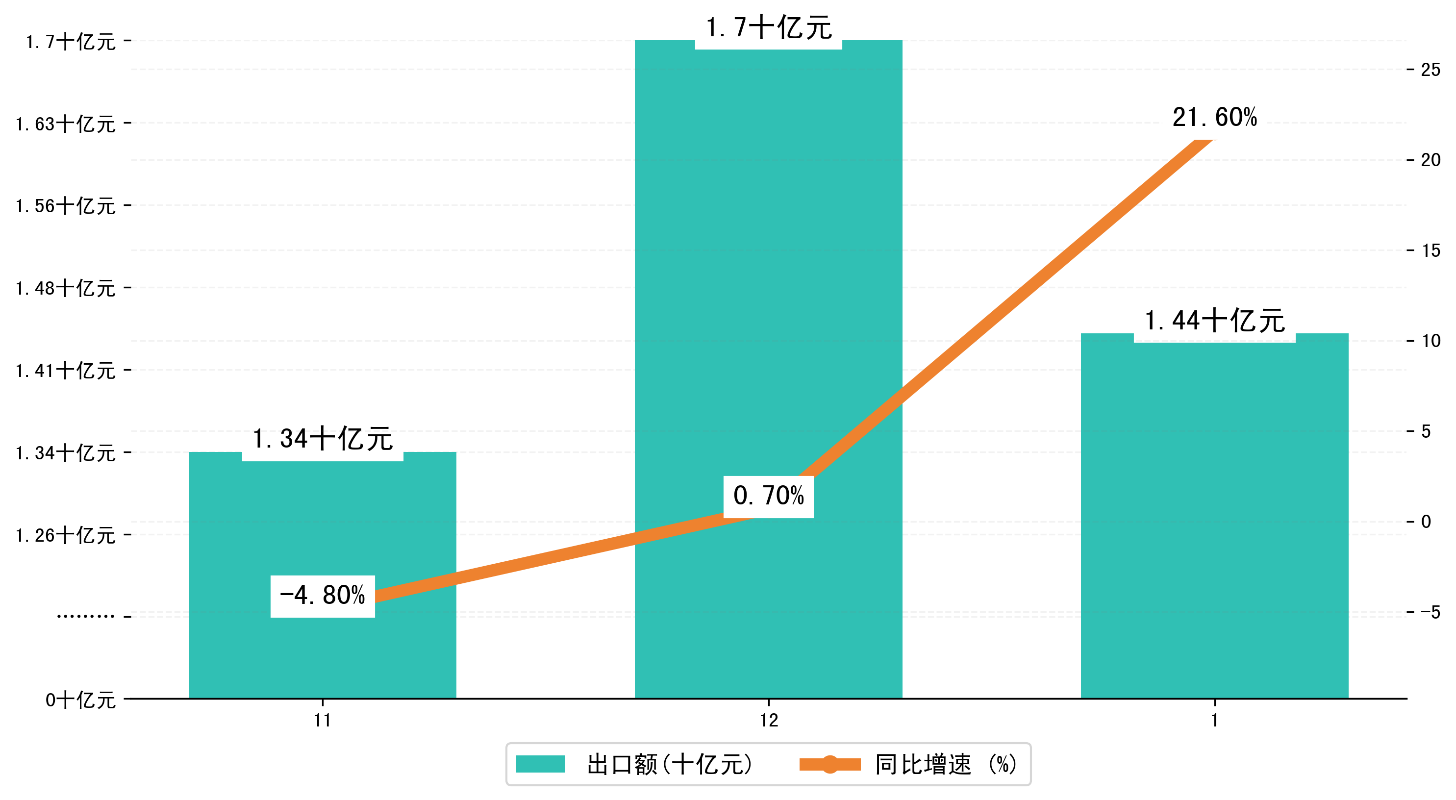 以人民币计,2025年1-1月宁夏回族自治区出口额为14,4334.2484万元,相比上年同期增加了2,5272.5738万元,同比增加了21.60%。