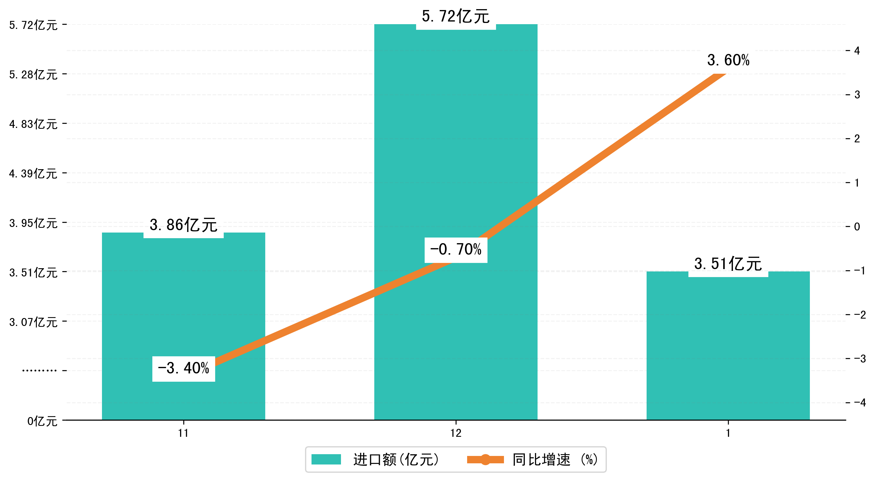 以美元计,2025年1-1月宁夏回族自治区进口额为4860.9962万美元,相比上年同期增加了88.156万美元,同比增加1.60%。