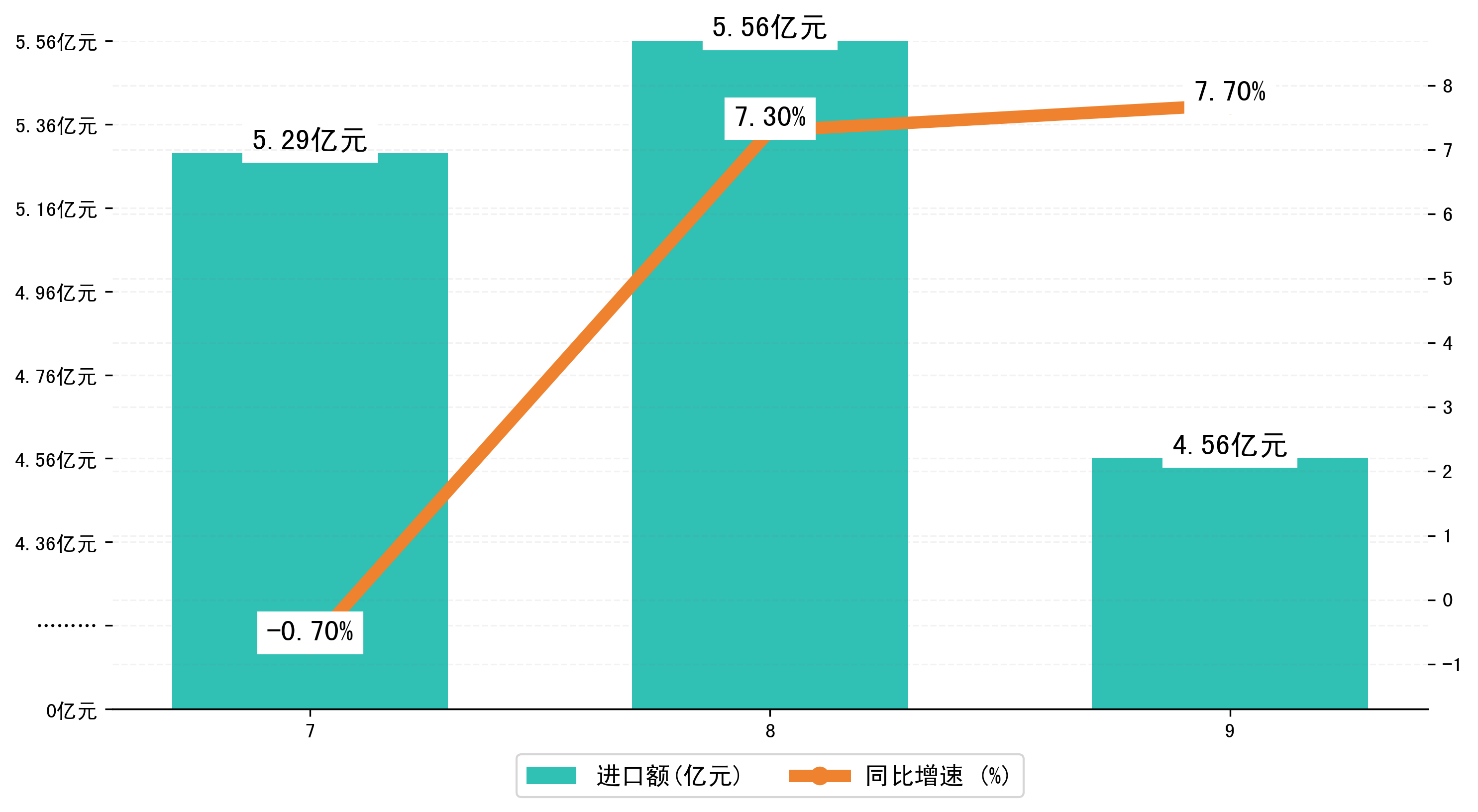 以人民币计,2025年1-9月宁夏回族自治区进口额为42,9548.7603万元,相比上年同期增加了1,2109.0232万元,同比增加了7.70%。