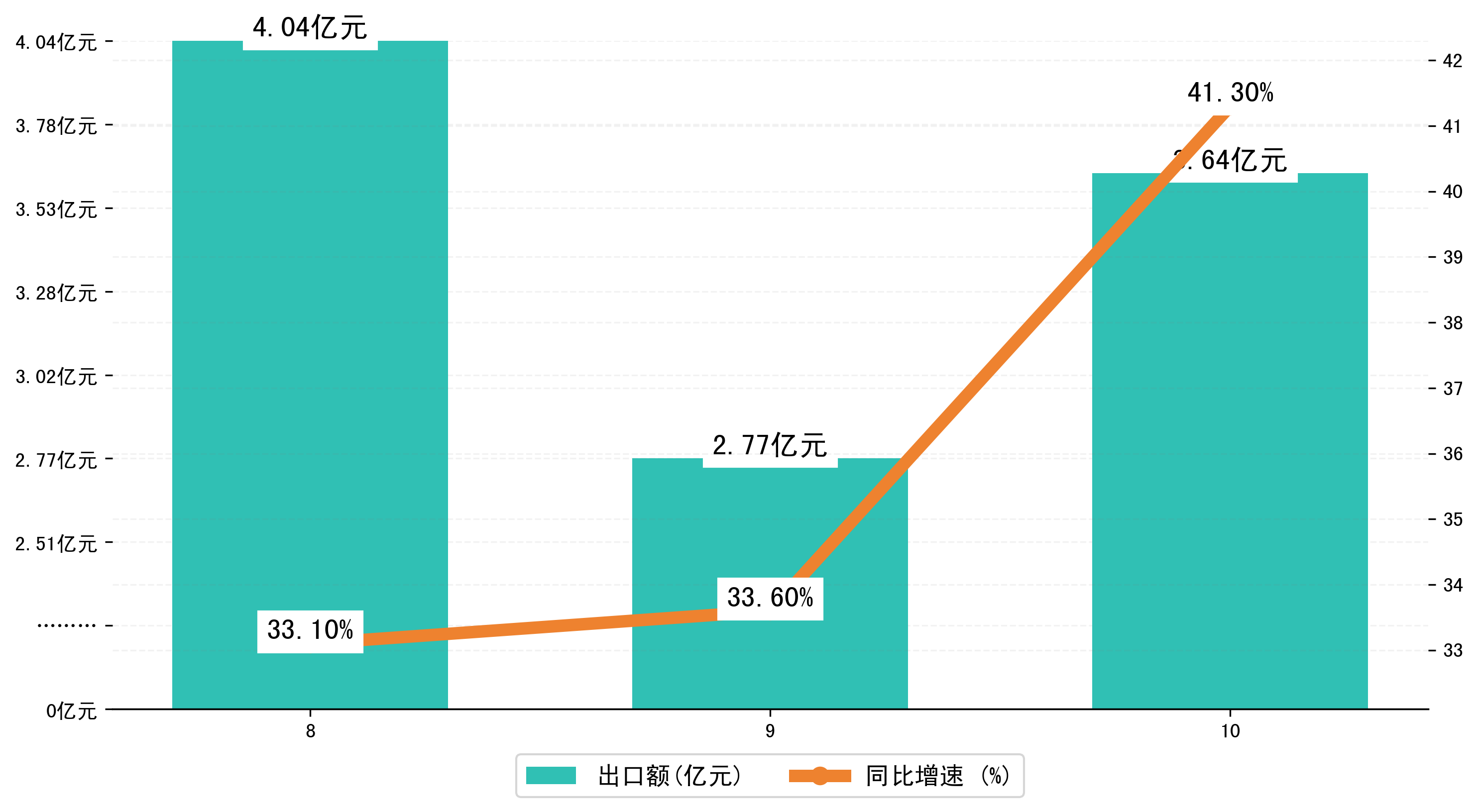以美元计,2024年1-10月青海省出口额为4,1979.6693万美元,相比上年同期增加了1,1763.6562万美元,同比增加38.90%。