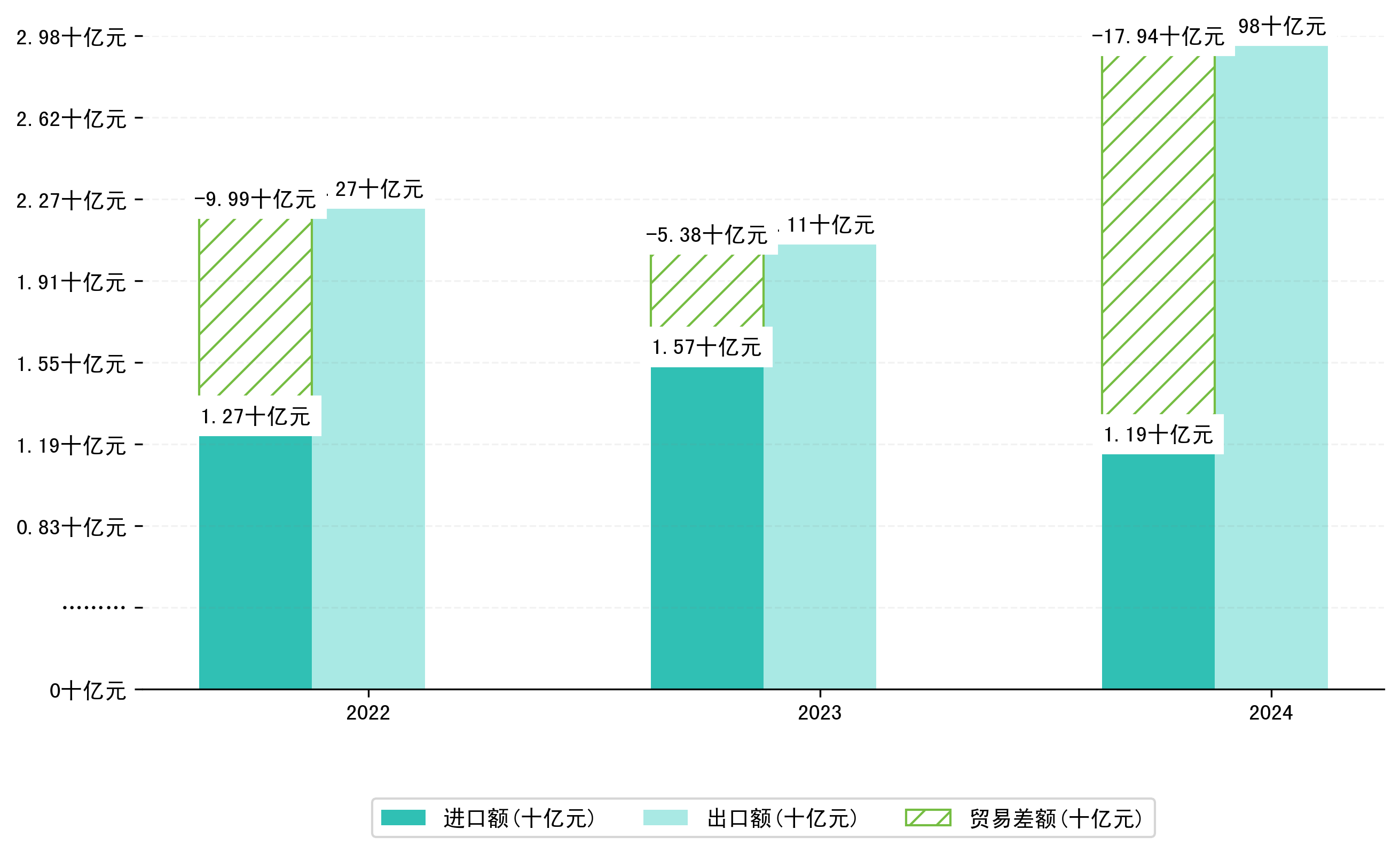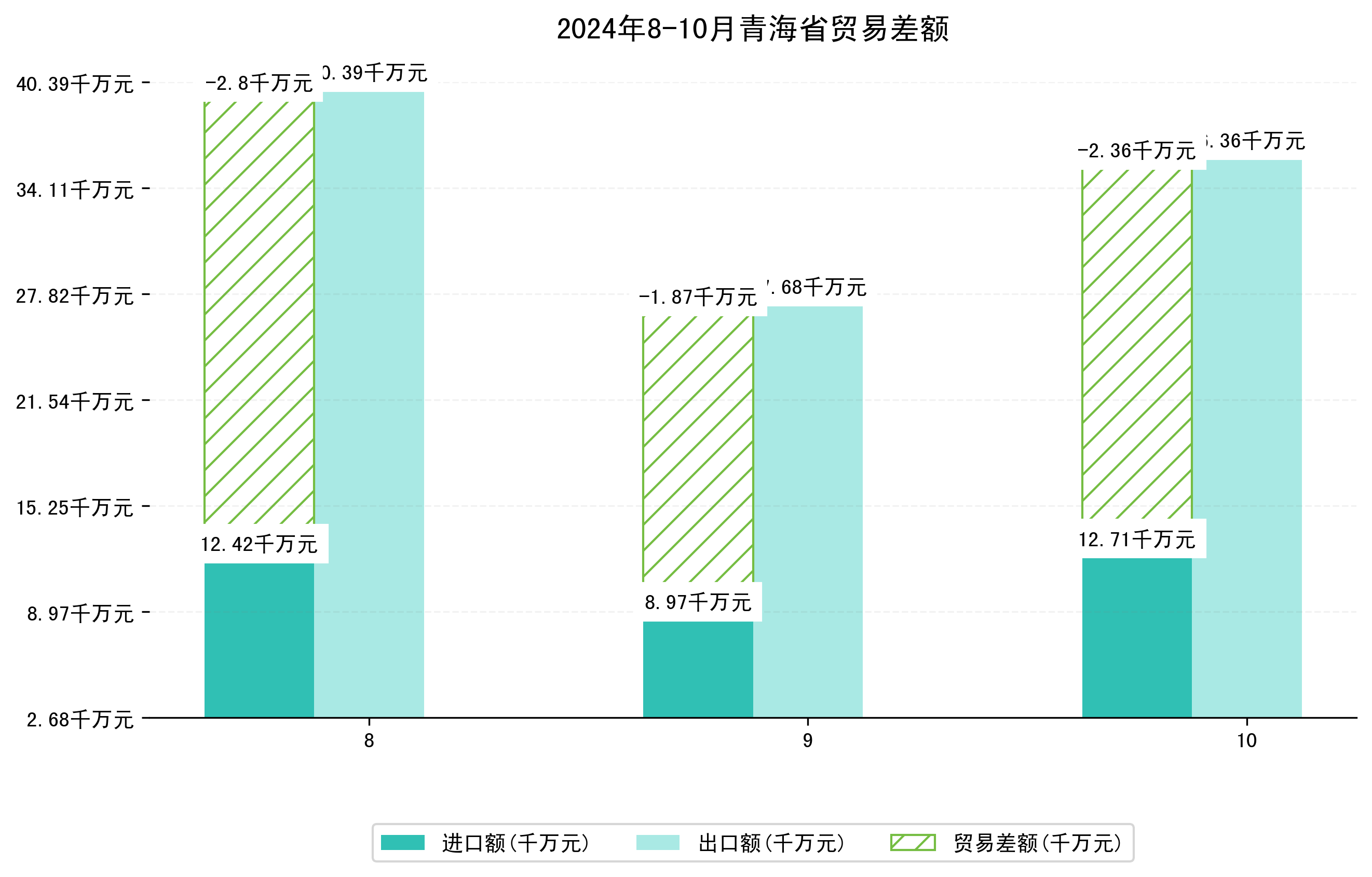 以人民币计,2024年1-10月青海省贸易差额为17,9357,2575万元(贸易顺差),相比上年同期增加了12,5574,6375万元,同比增加233.49%。