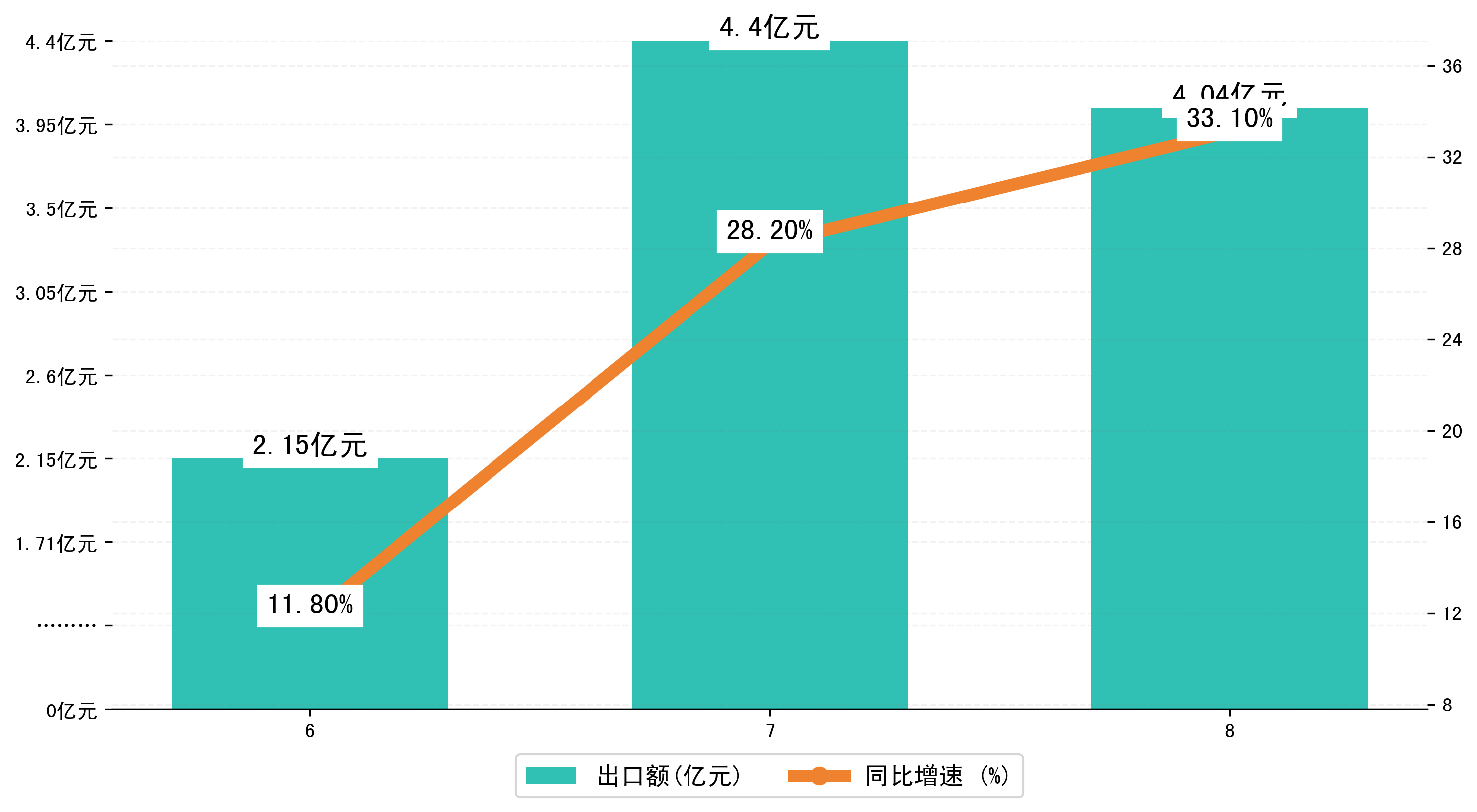 以美元计,2024年1-8月青海省出口额为3,2944.4019万美元,相比上年同期增加了7099.6618万美元,同比增加30.00%。