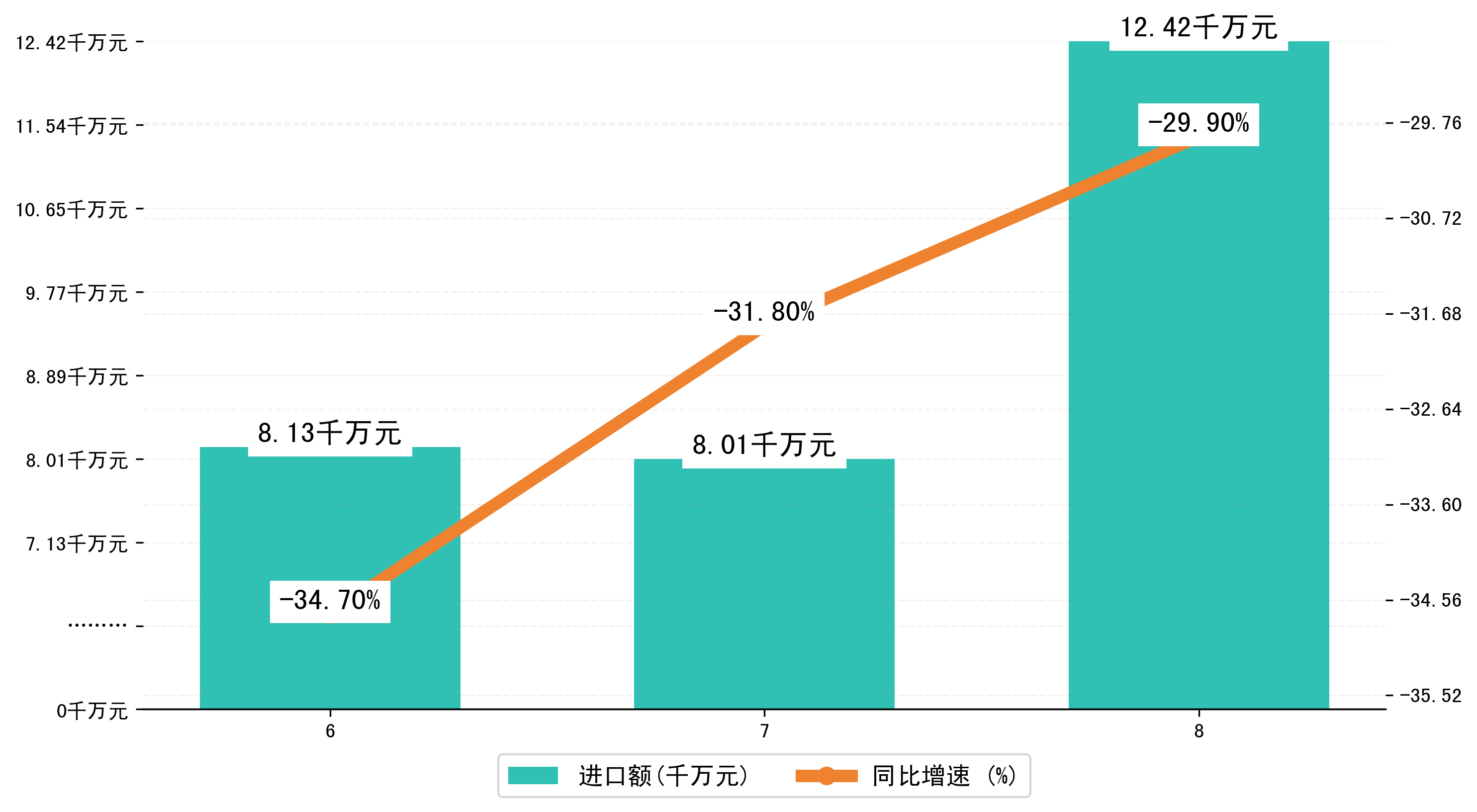 以人民币计,2024年8月青海省进口额为1,2417.1937万元,相比上月增加了4406.7139万元;相比上年同期减少了998.5159万元,同比减少了-29.90%。