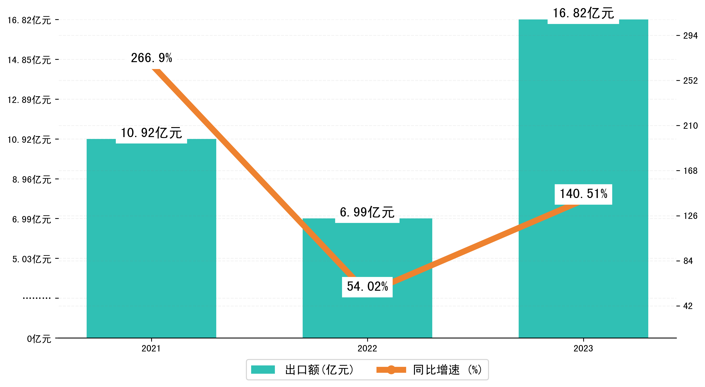 以美元计,2023年1-1月常德市出口额为2,4023.3597万美元,相比上年同期增加了1,3054.2909万美元,同比增加121.70%。
