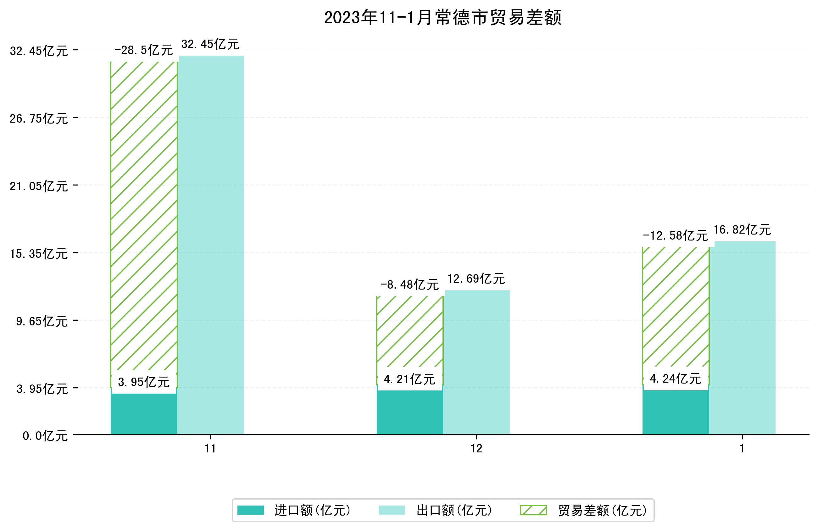 以人民币计,2023年1月常德市贸易差额为12,5833,8320万元(贸易顺差),相比上月增加了4,1049,2208万元,即5995,7092万美元;相比上年同期增加了6,8961,6412万元,同比增加121.26%。