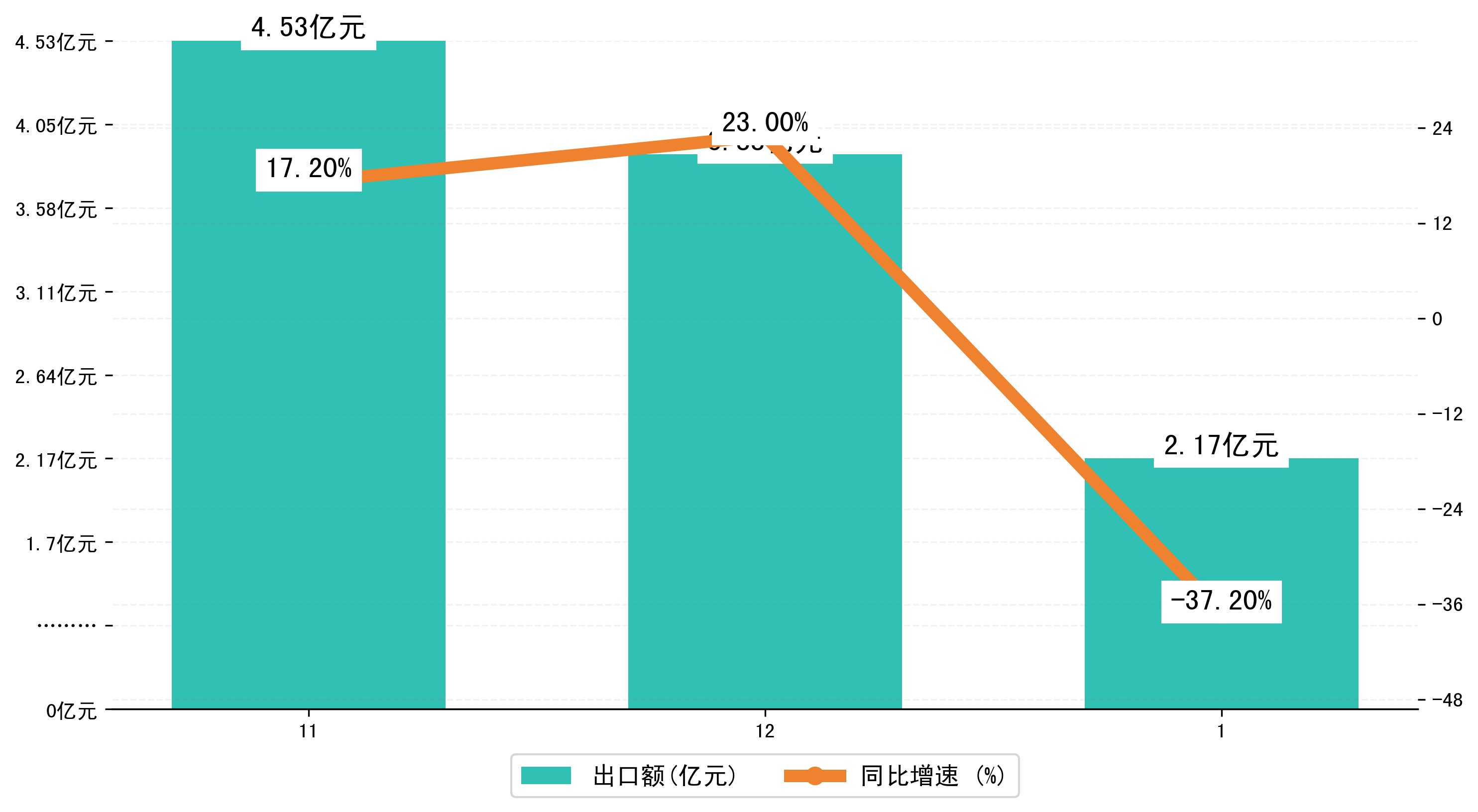 以美元计,2024年1-1月青海省出口额为3053.886万美元,相比上年同期减少了1909.8277万美元,同比减少-38.50%。