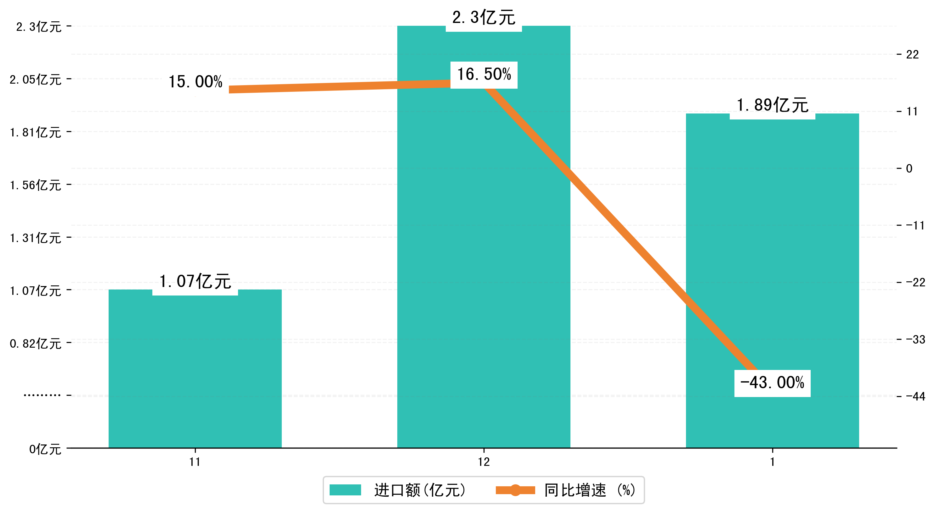以美元计,2024年1-1月青海省进口额为2664.2295万美元,相比上年同期减少了1855.9948万美元,同比减少-43.60%。