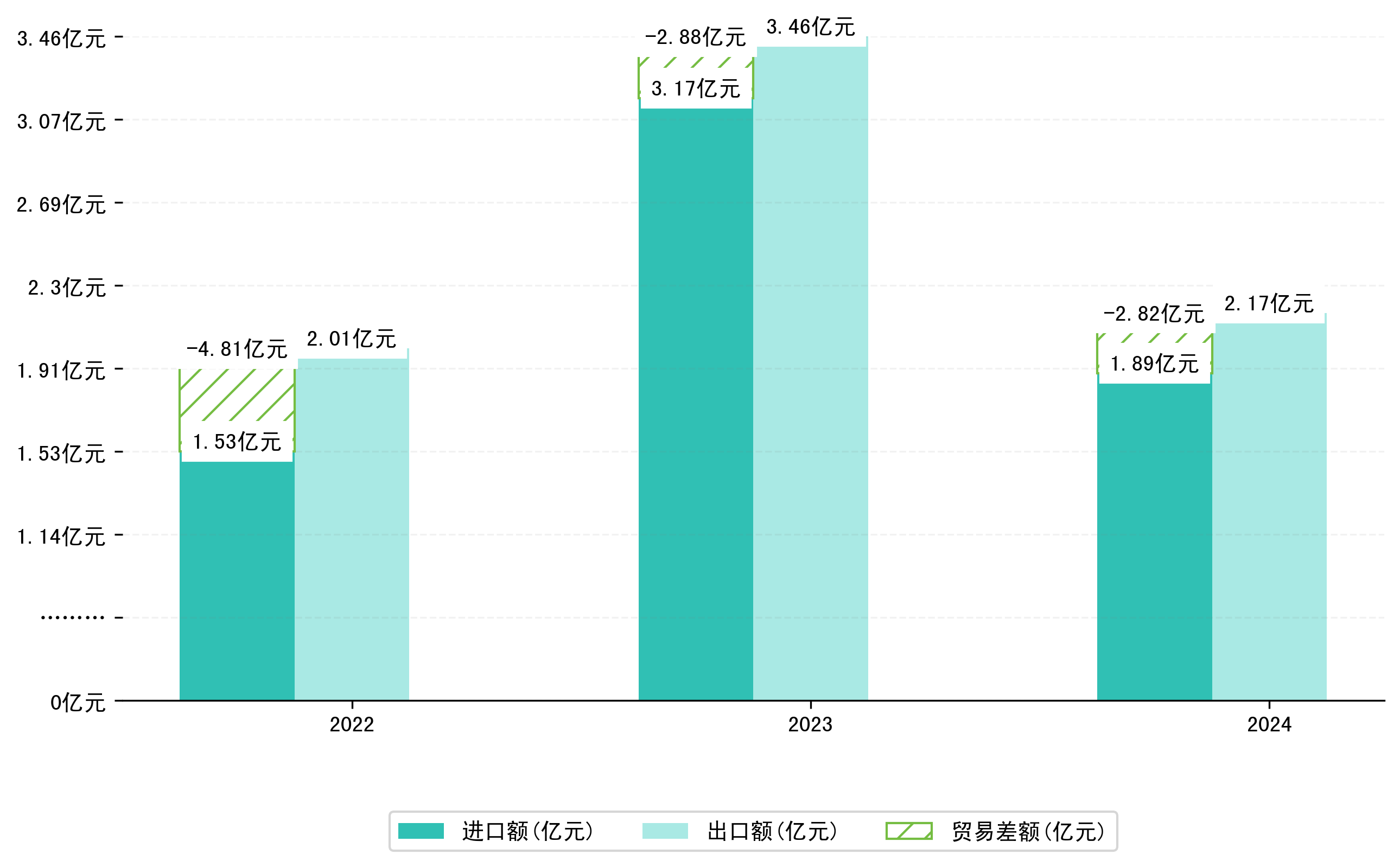 以美元计,2024年1-1月青海省贸易差额为389,6565万美元(贸易顺差),相比上年同期减少了53,8329万美元,同比减少-12.14%。