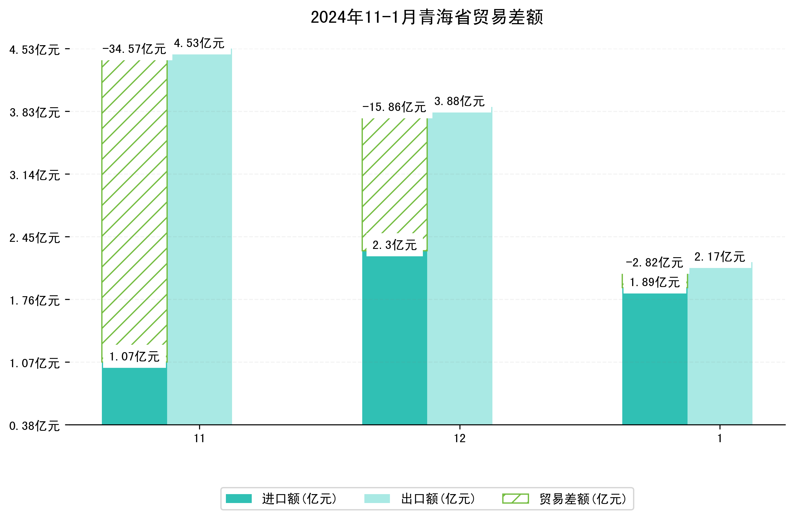 以人民币计,2024年1-1月青海省进出口总额为4,0623.6421万元,相比上年同期减少了2,5707.7424万元,同比减少了-40.00%。