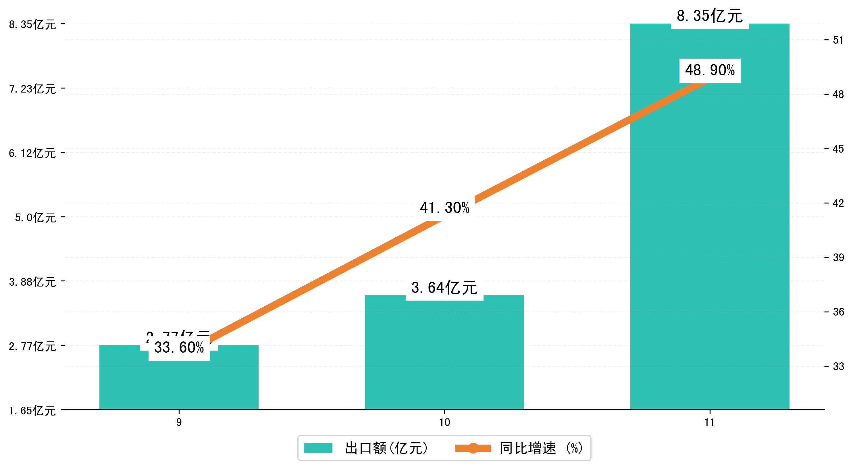 以美元计,2024年1-11月青海省出口额为5,3707.6191万美元,相比上年同期增加了1,7187.5495万美元,同比增加47.10%。