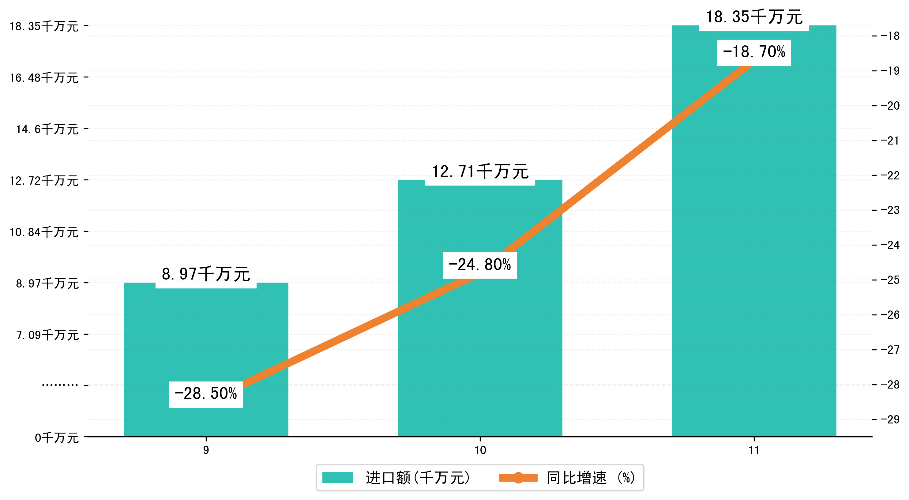 以人民币计,2024年11月青海省进口额为1,8353.1801万元,相比上月增加了5640.9915万元;相比上年同期增加了7664.3293万元,同比减少了-18.70%。