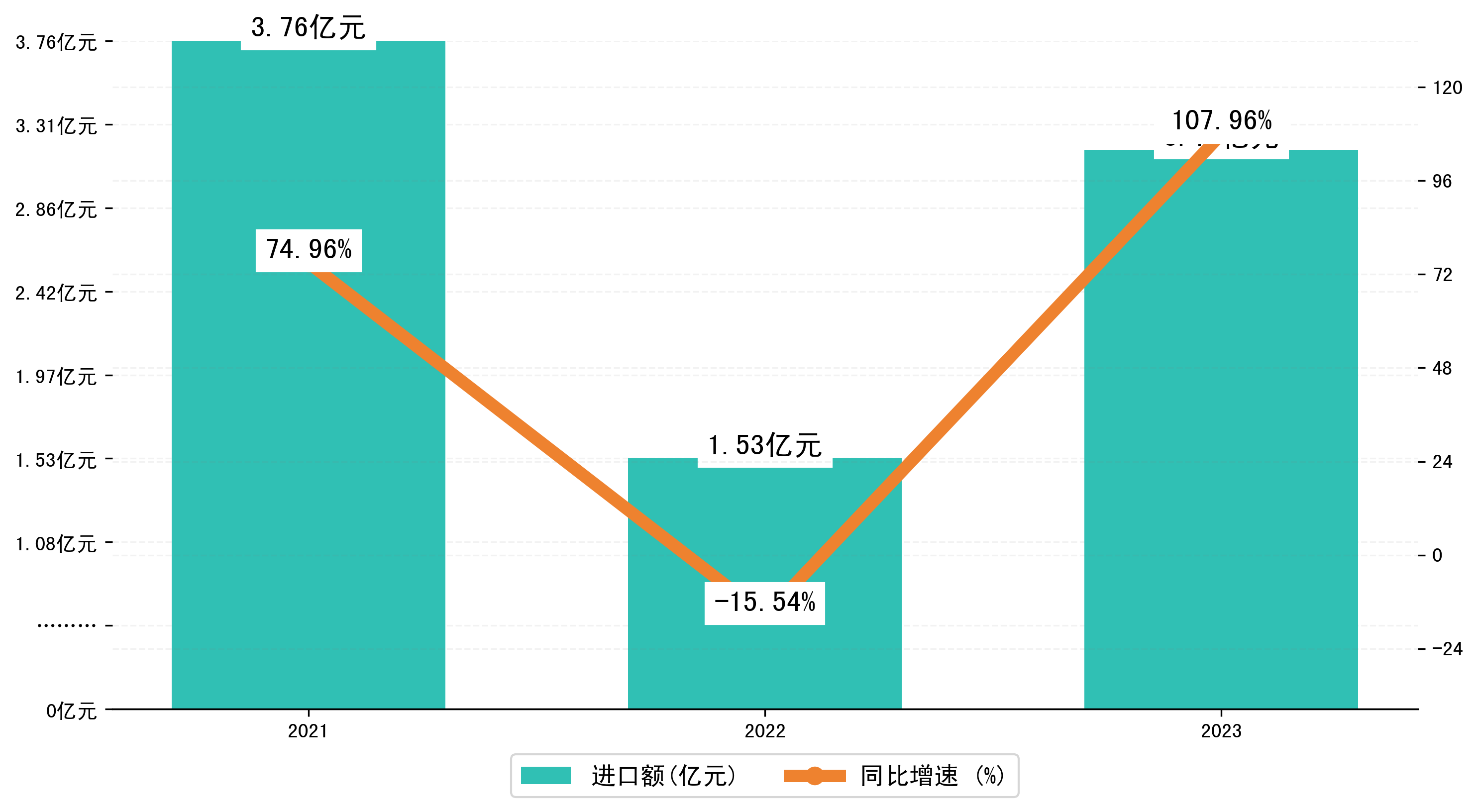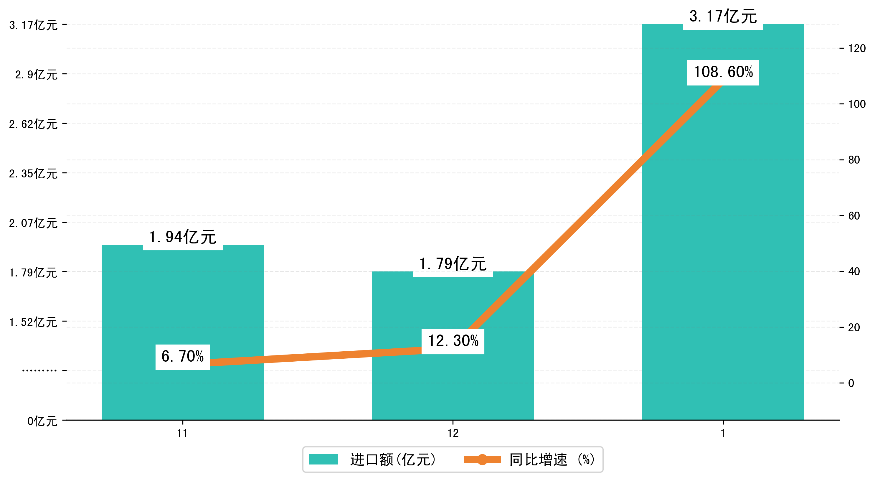 以美元计,2023年1-1月青海省进口额为4520.2243万美元,相比上年同期增加了2126.8082万美元,同比增加89.50%。