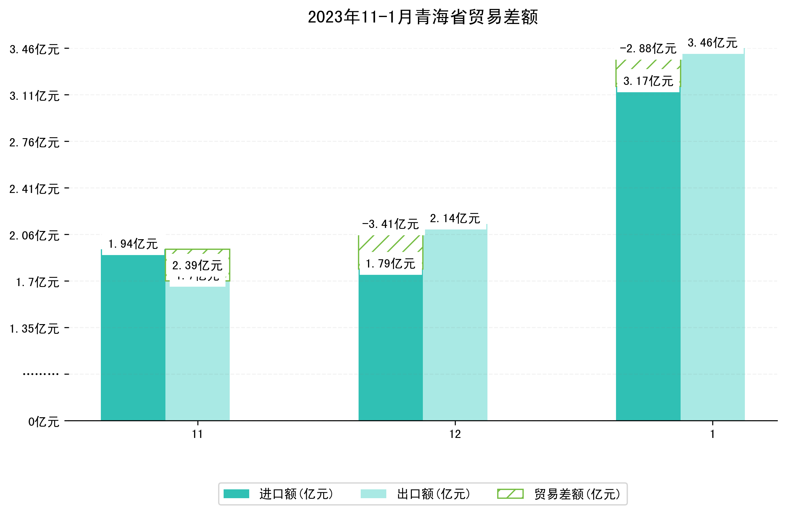 以美元计,2023年1-1月青海省进出口总额为9483.938万美元,相比上年同期增加了3946.5602万美元,同比增加71.20%。