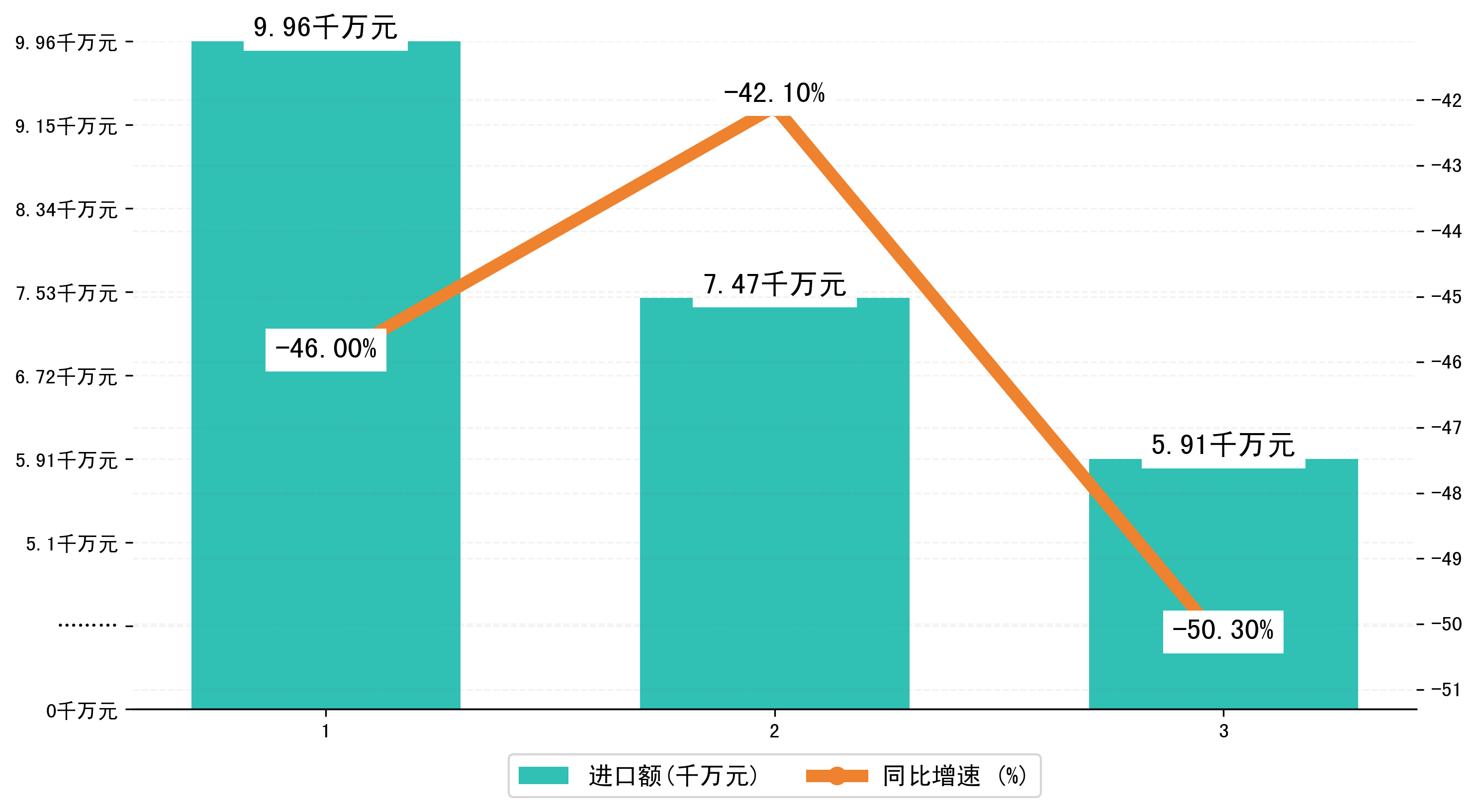 以美元计,2025年1-3月青海省进口额为3249.857万美元,相比上年同期减少了3419.8293万美元,同比减少-50.90%。