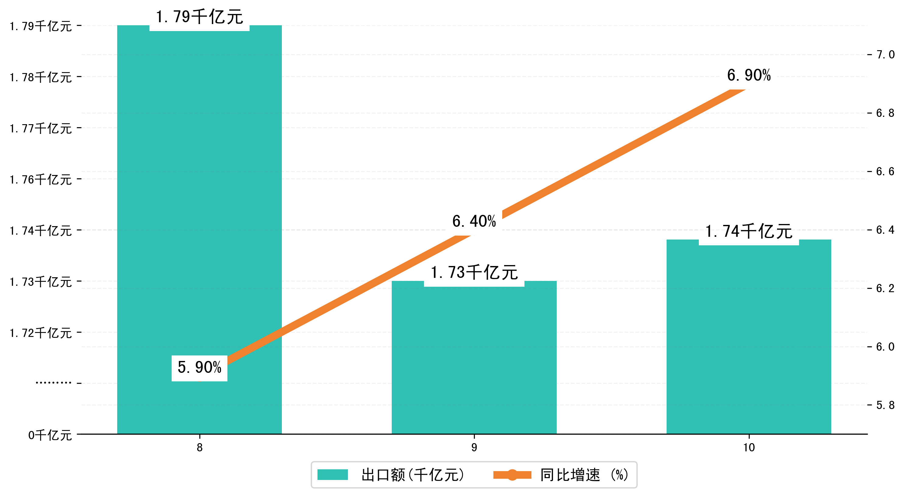 以人民币计,2024年1-10月山东省出口额为1,6934,7165.3529万元,相比上年同期增加了998,1702.6761万元,同比增加了6.90%。