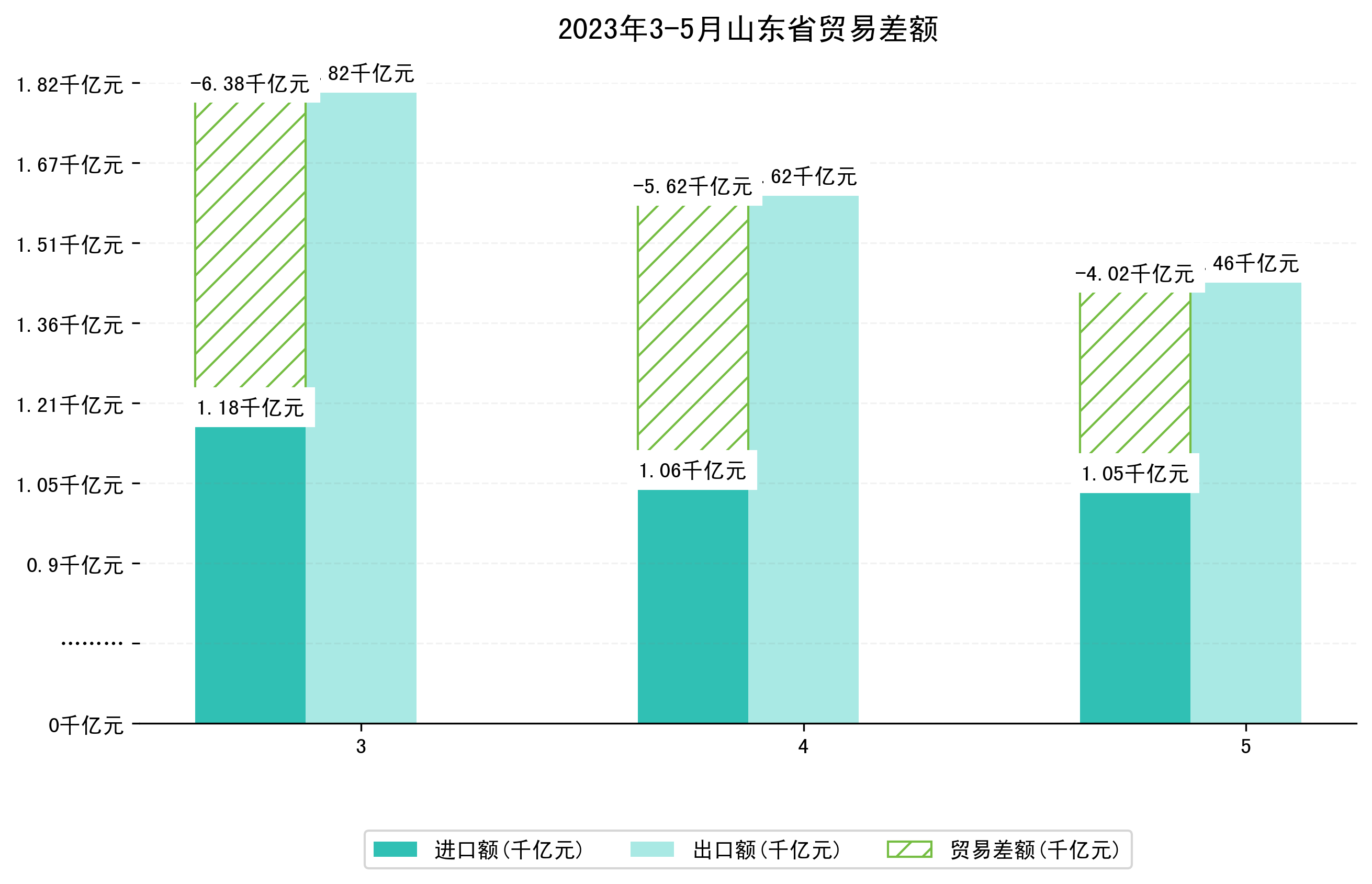 以人民币计,2023年5月山东省贸易差额为401,7611,9757万元(贸易顺差),相比上月减少了160,5458,6722万元,即23,5175,6790万美元;相比上年同期减少了290,0413,7304万元,同比减少-41.93%。