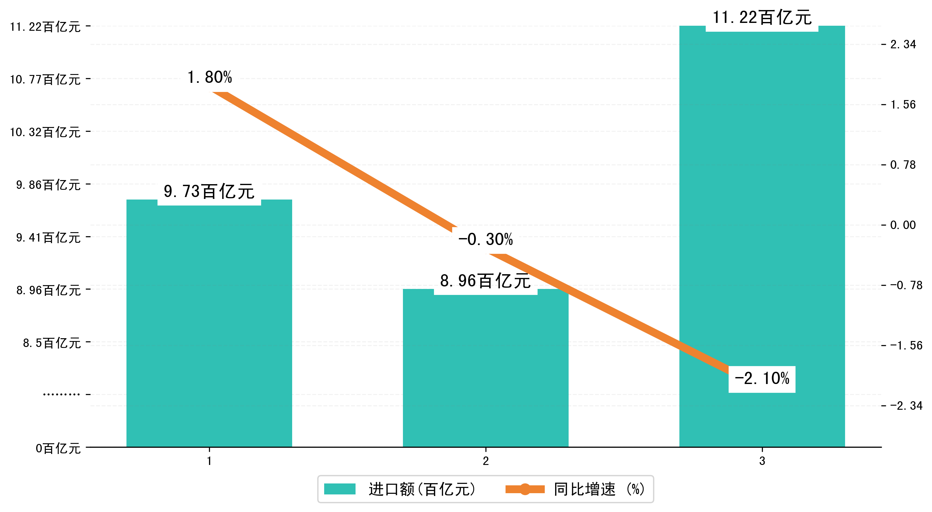 以人民币计,2024年3月山东省进口额为1122,3319.7166万元,相比上月增加了226,7257.8189万元;相比上年同期减少了57,6682.1221万元,同比减少了-2.10%。