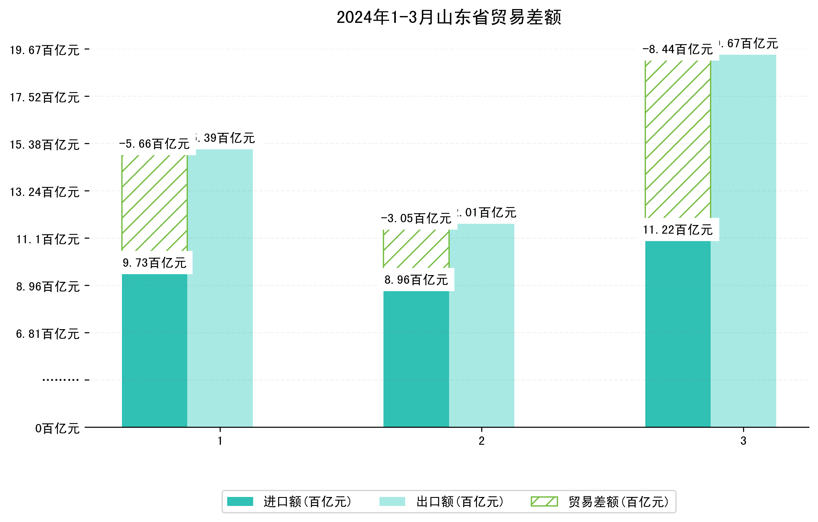 一、2024年3月山东省单月出口总额及进出口差额统计分析