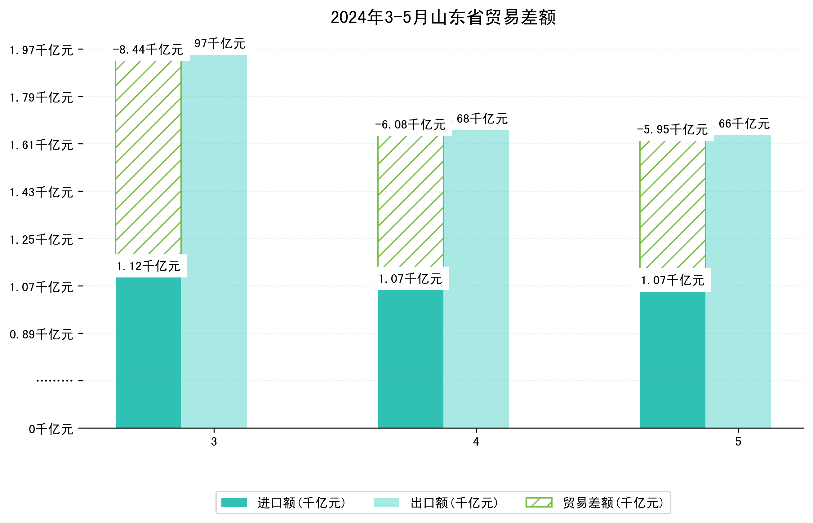 以人民币计,2024年5月山东省贸易差额为595,1596,3452万元(贸易顺差),相比上月减少了12,5573,3821万元,即1,7948,5145万美元;相比上年同期增加了193,3984,3695万元,同比增加48.14%。