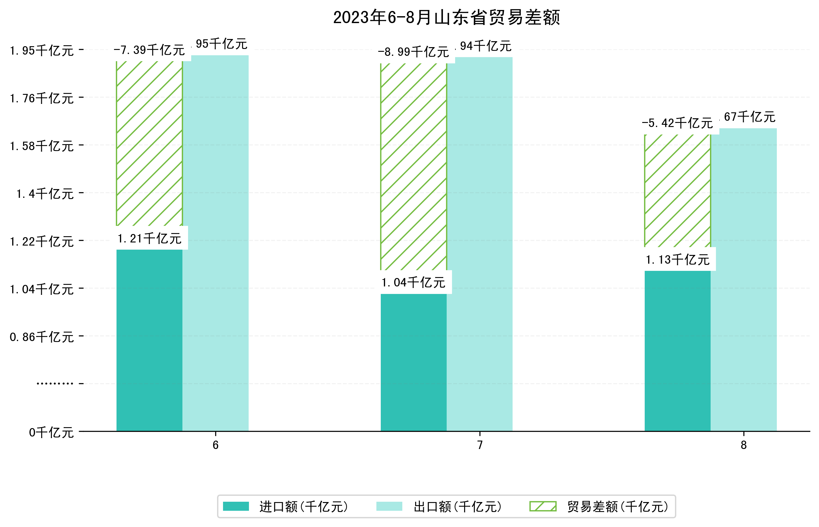 以人民币计,2023年8月山东省贸易差额为541,8967,8573万元(贸易顺差),相比上月减少了357,4452,2739万元,即50,0036,6739万美元;相比上年同期减少了160,9240,9065万元,同比减少-22.9%。