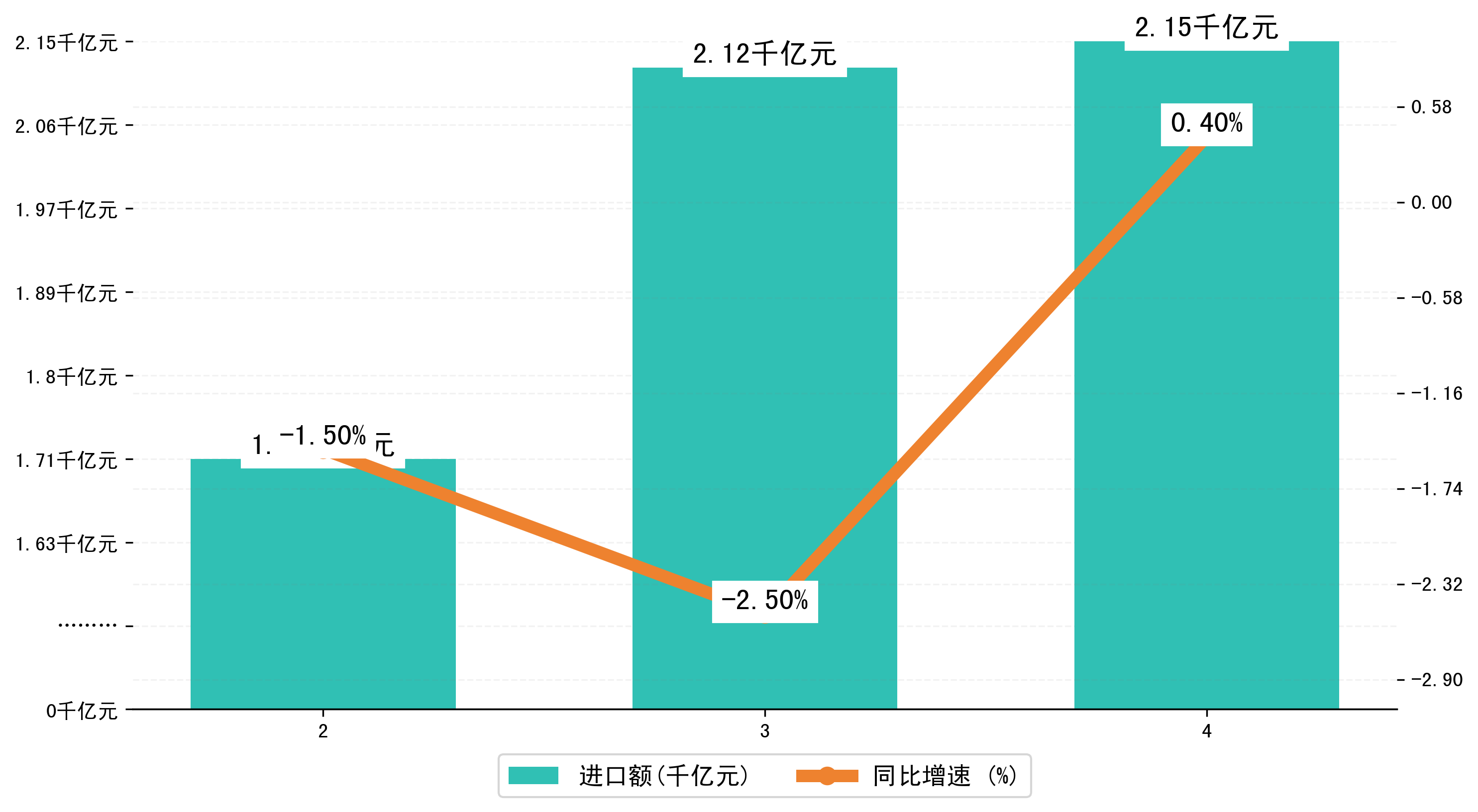 以人民币计,2024年4月上海市进口额为2147,9508.7824万元,相比上月增加了27,3559.5533万元;相比上年同期增加了197,5042.4348万元,同比增加了0.40%。