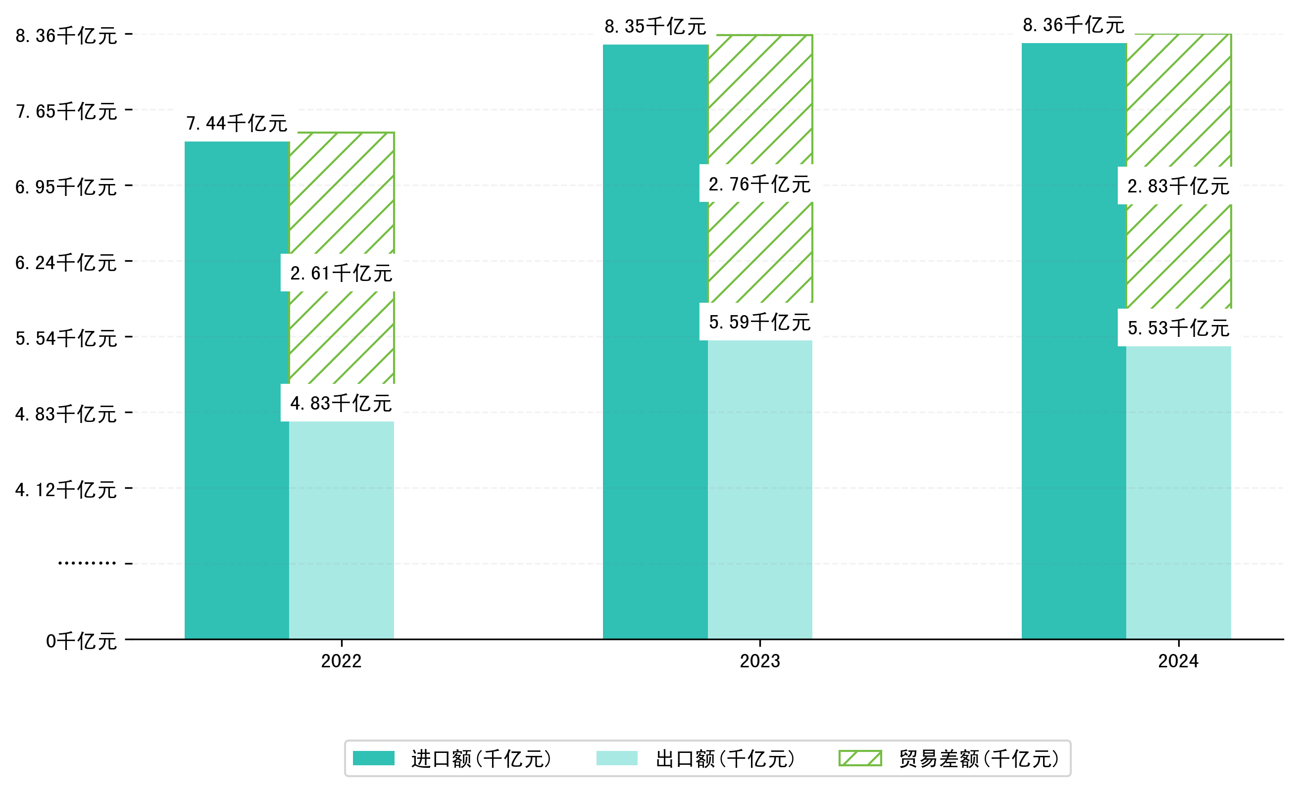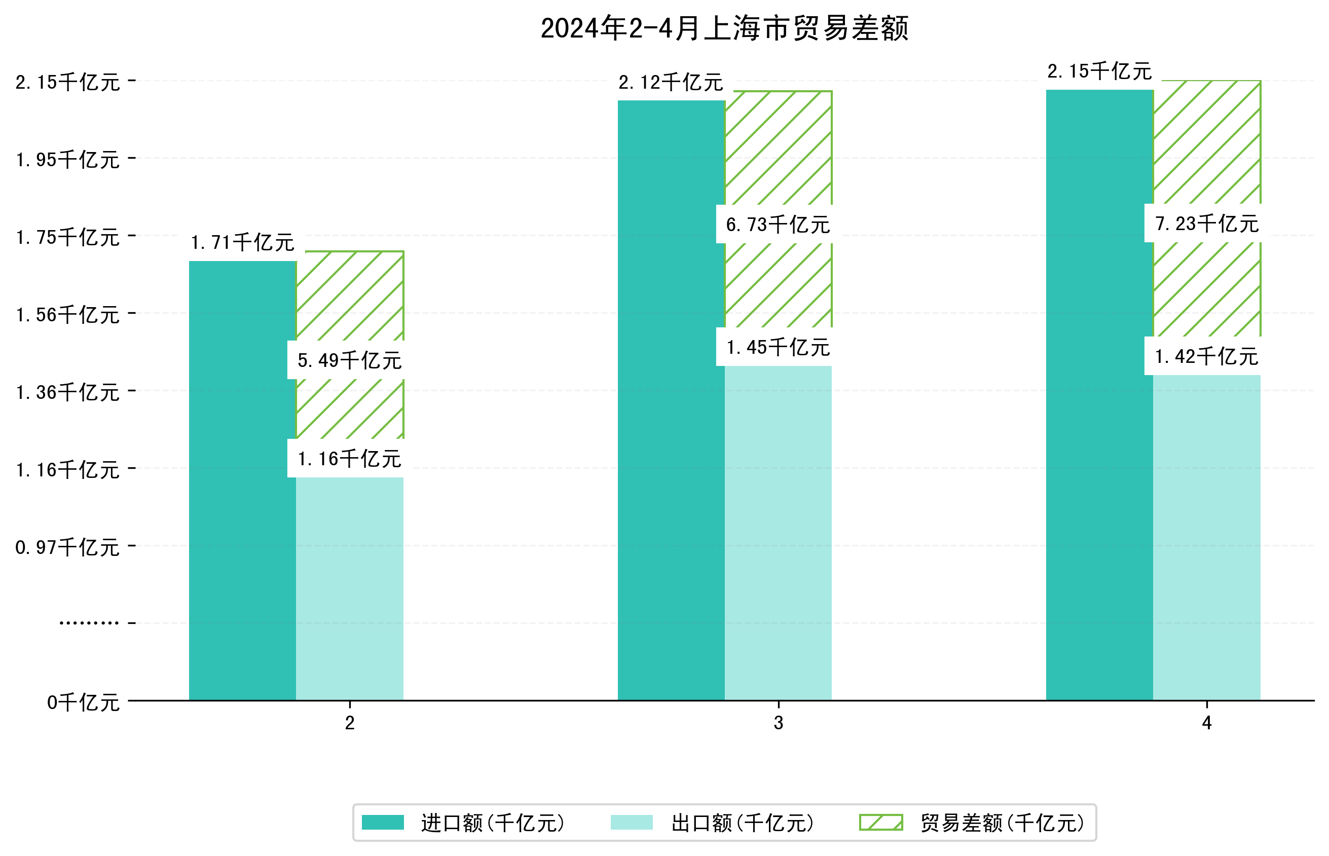 以人民币计,2024年4月上海市贸易差额为723,3748,4160万元(贸易逆差),相比上月减少了50,2867,8353万元,即7,0340,4476万美元;相比上年同期减少了288,7530,9971万元,同比减少66.44%。