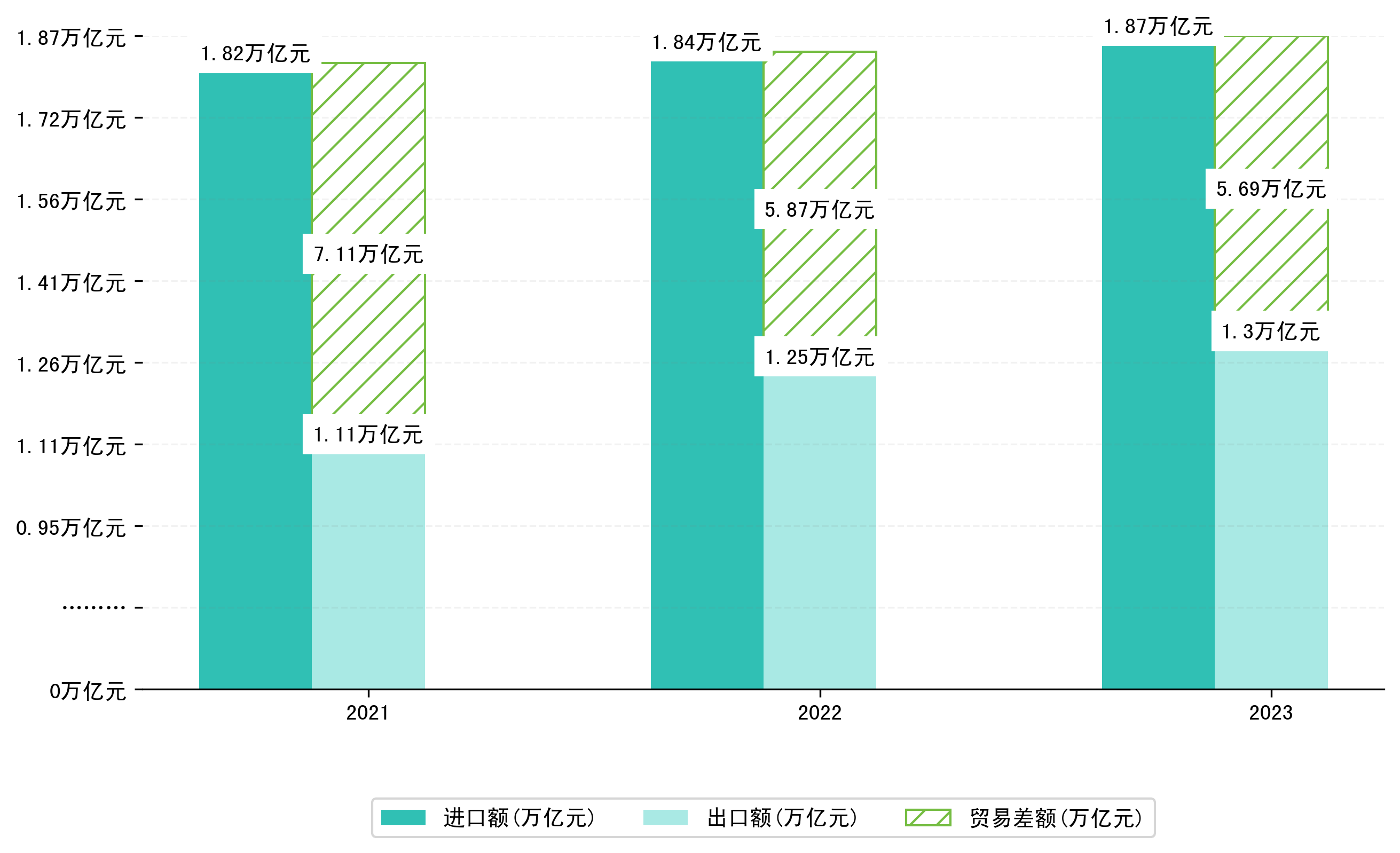 以人民币计,2023年1-9月上海市贸易差额为5687,1123,3601万元(贸易逆差),相比上年同期增加了184,2709,7385万元,同比增加-3.14%。