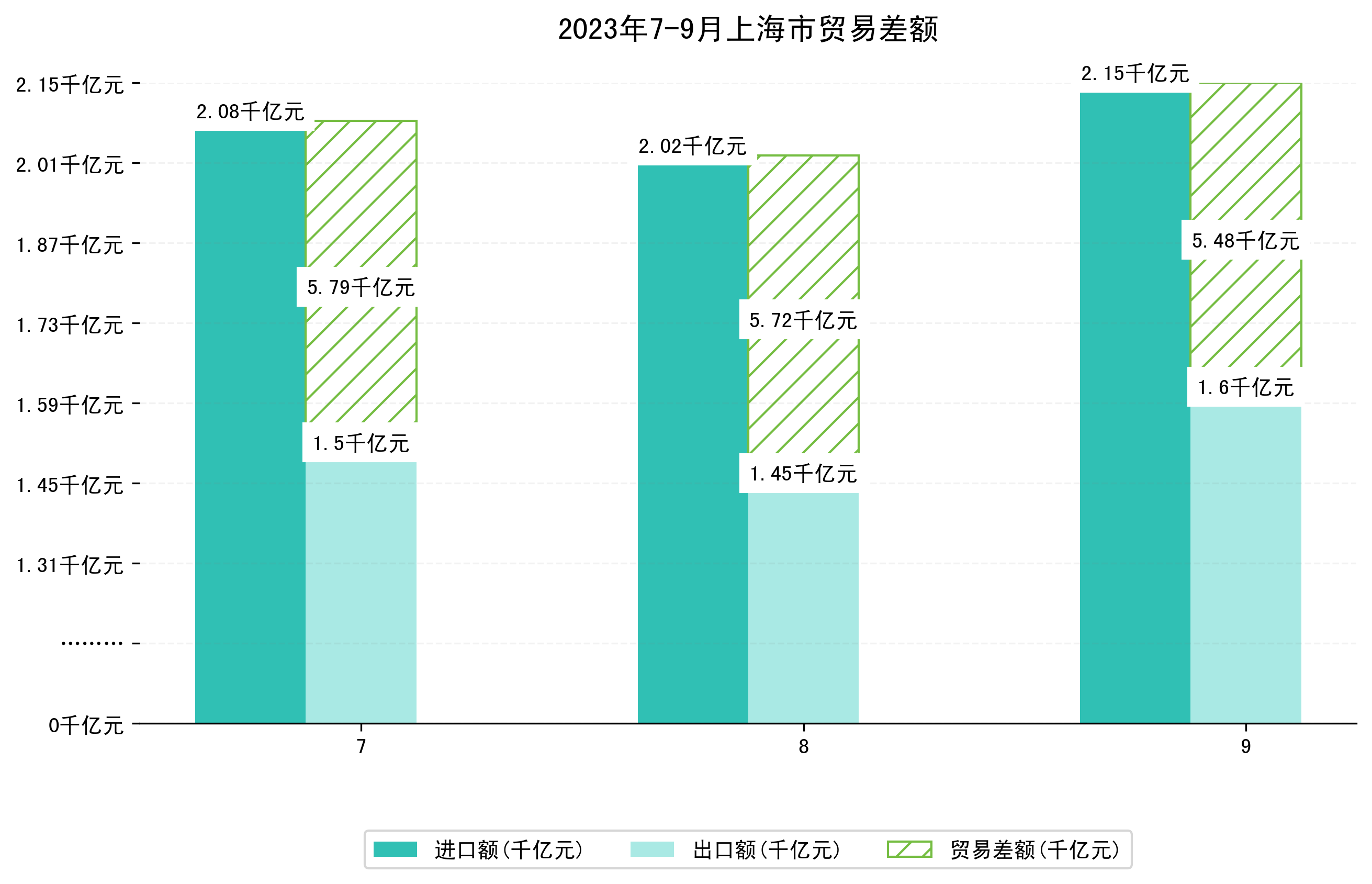 以人民币计,2023年9月上海市贸易差额为547,6556,8613万元(贸易逆差),相比上月增加了23,8799,8630万元,即3,2065,6666万美元;相比上年同期增加了72,8064,9170万元,同比增加-11.73%。