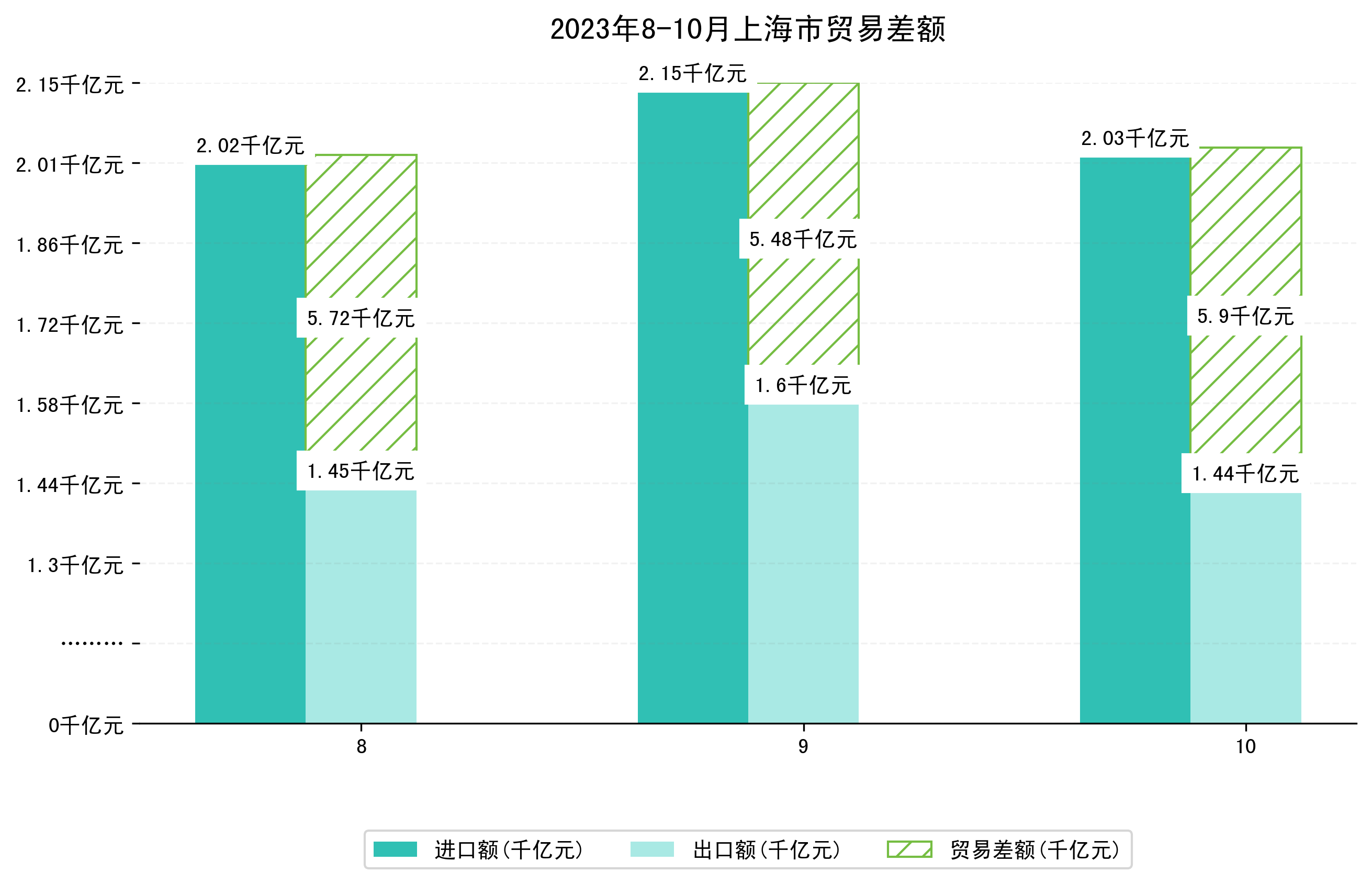以人民币计,2023年10月上海市贸易差额为589,7141,5463万元(贸易逆差),相比上月减少了42,0584,6850万元,即5,6520,1942万美元;相比上年同期减少了117,0270,4890万元,同比减少24.76%。