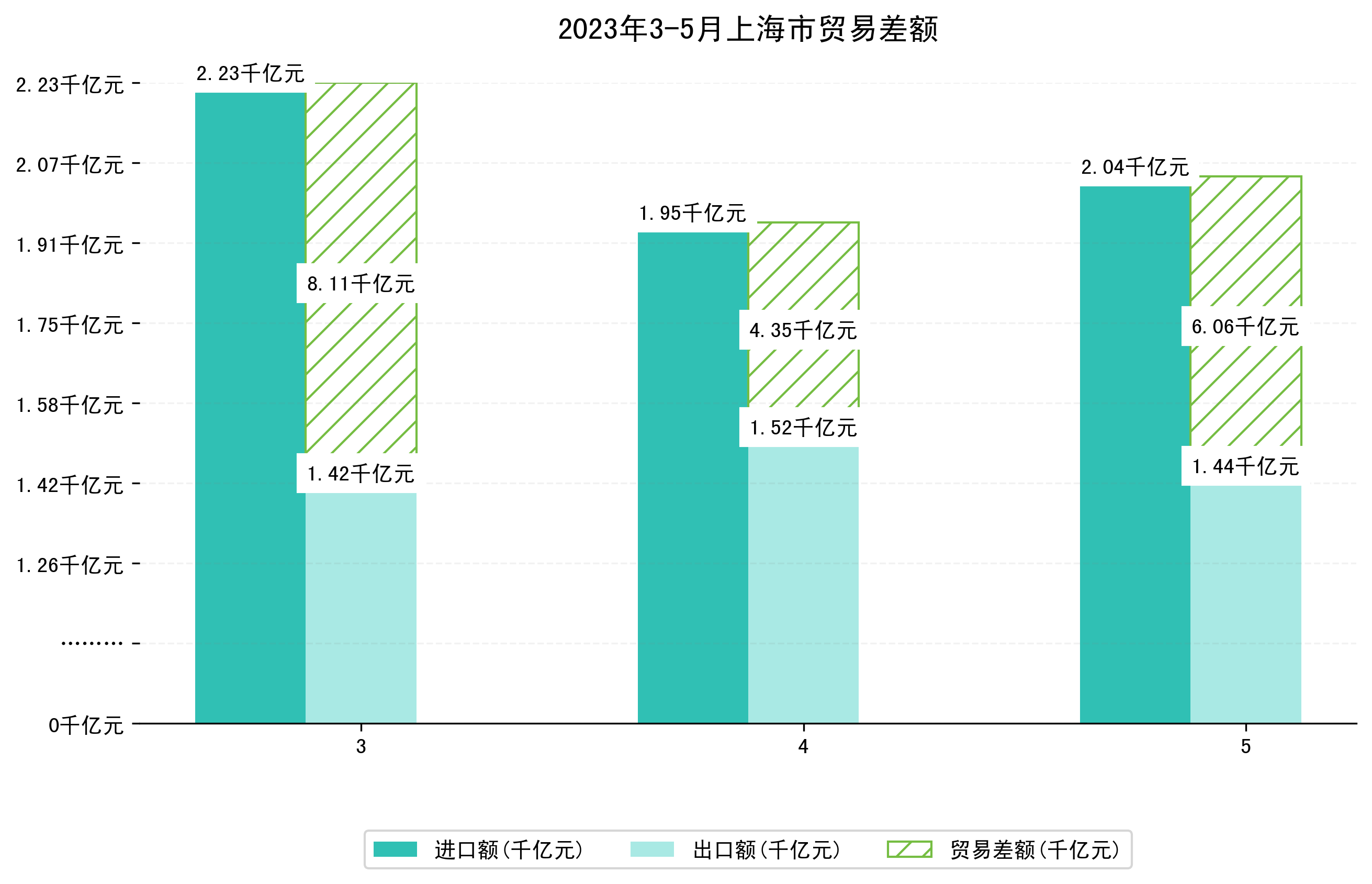以人民币计,2023年1-5月上海市贸易差额为3366,6208,3664万元(贸易逆差),相比上年同期减少了116,2937,6864万元,同比减少3.58%。