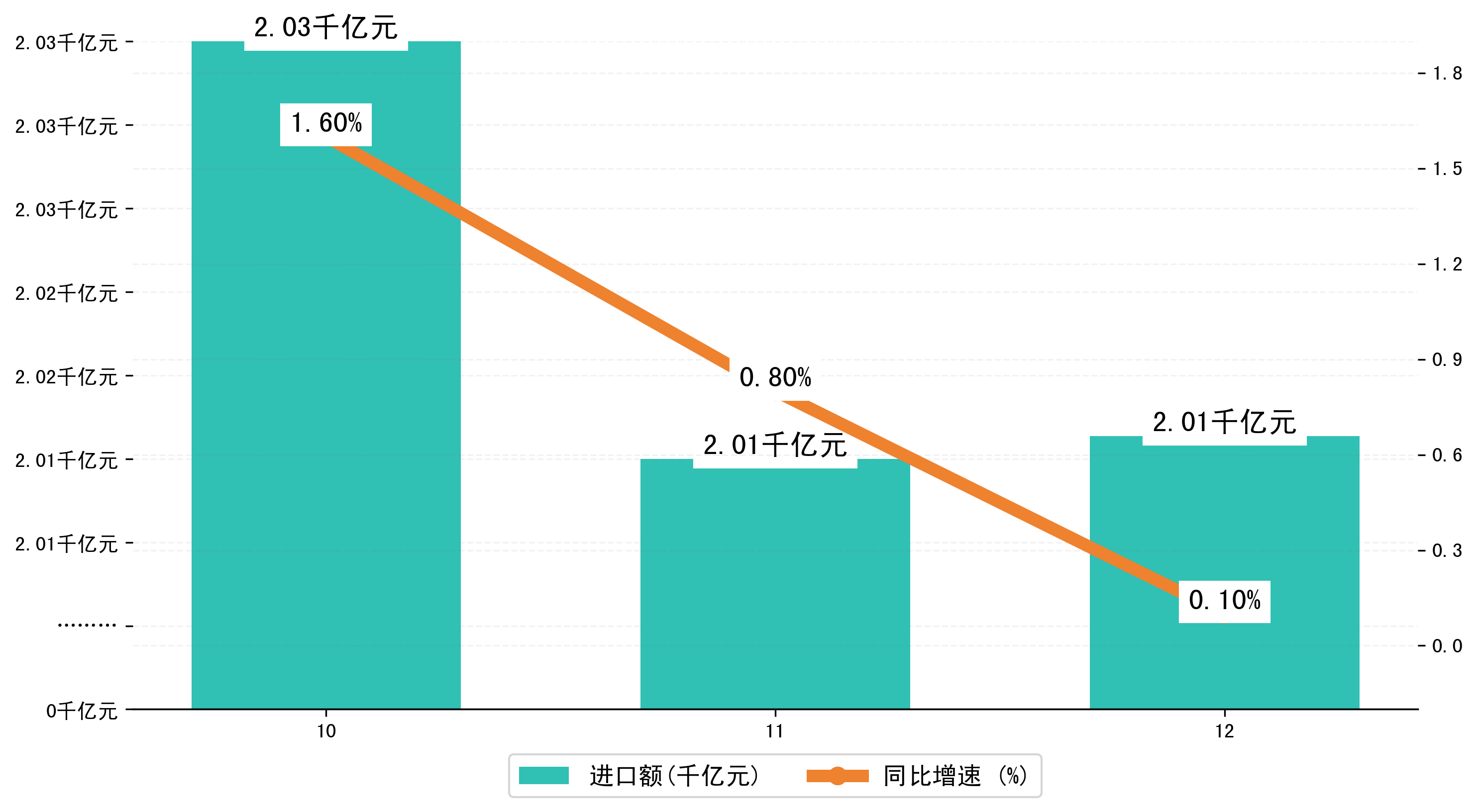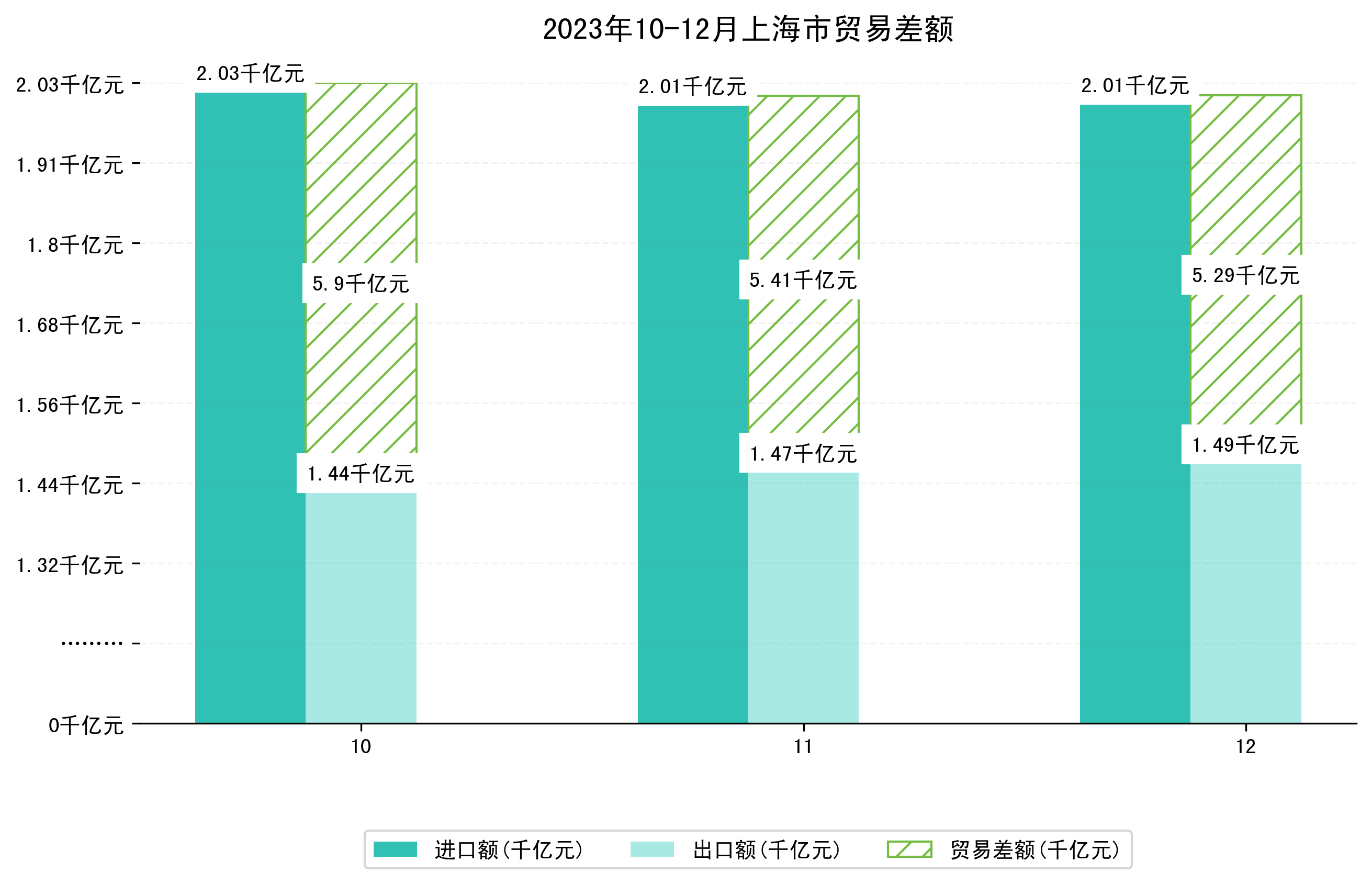 以人民币计,2023年12月上海市进口额为2014,7613.5089万元,相比上月增加了1,0296.0026万元;相比上年同期减少了138,3403.6183万元,同比增加了0.10%。