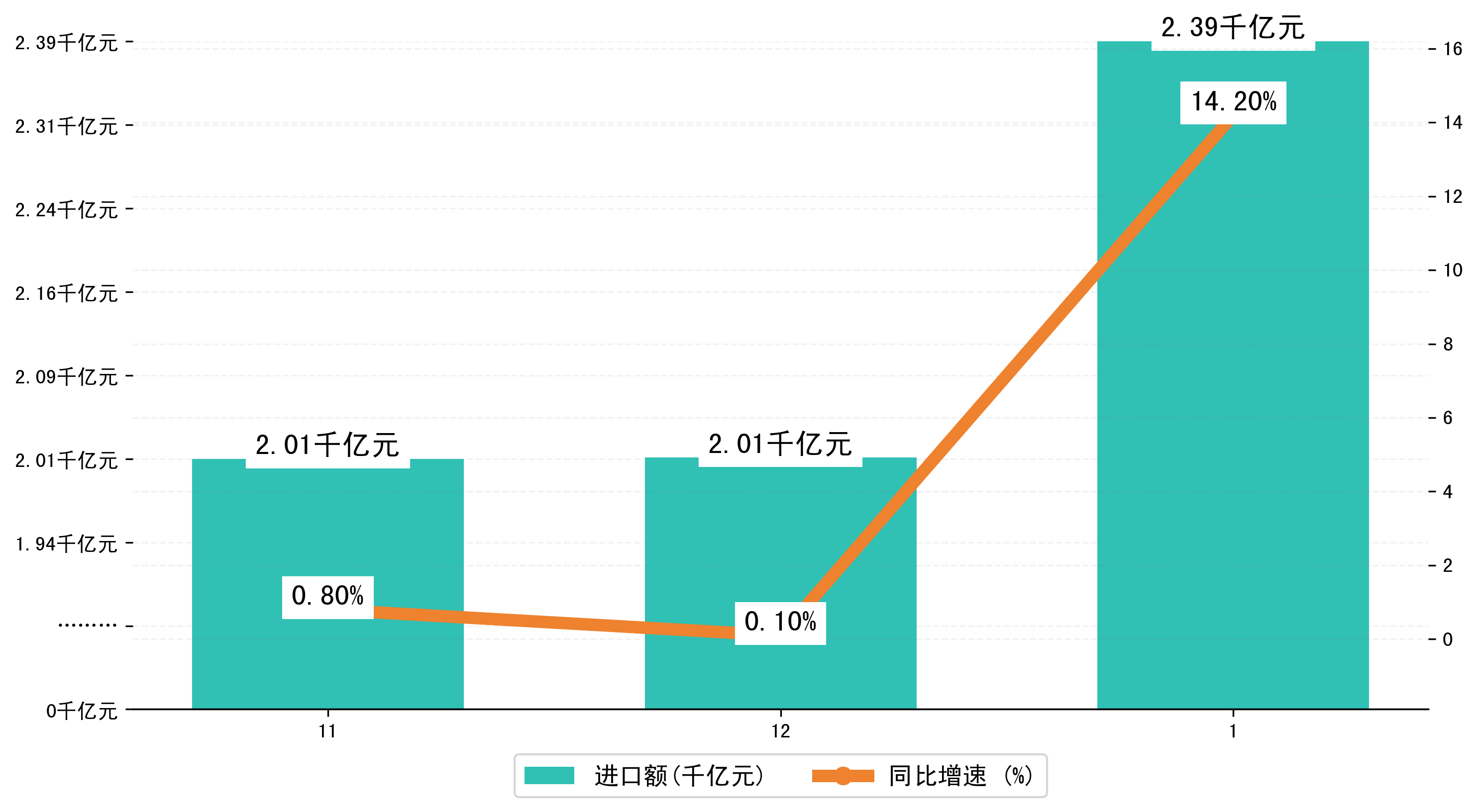 以人民币计,2024年1月上海市进口额为2387,9462.3443万元,相比上月增加了373,1848.8354万元;相比上年同期增加了298,9978.6741万元,同比增加了14.20%。