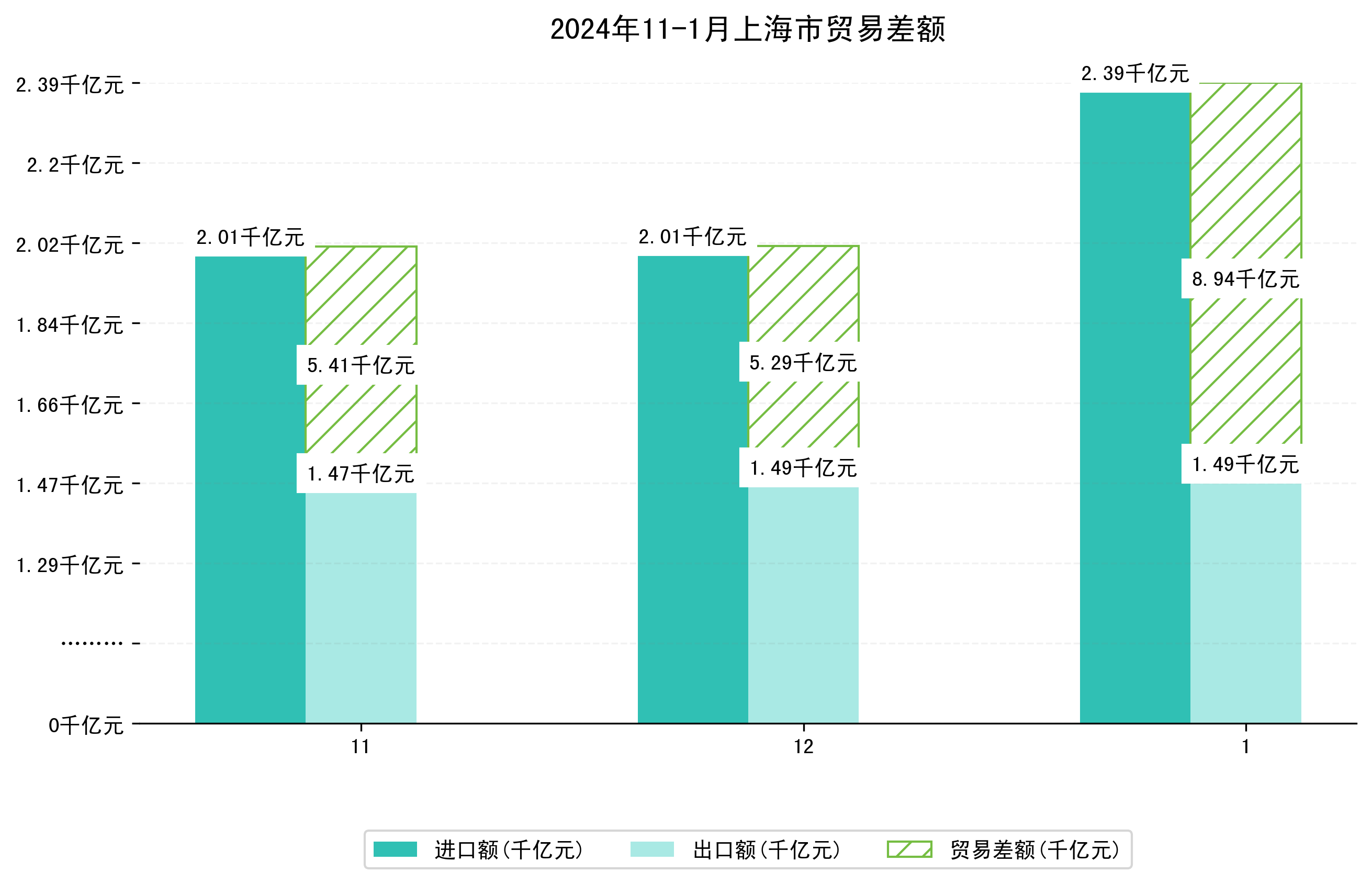 以美元计,2024年1-1月上海市进出口总额为547,3016.2513万美元,相比上年同期增加了38,1396.9578万美元,同比增加7.40%。