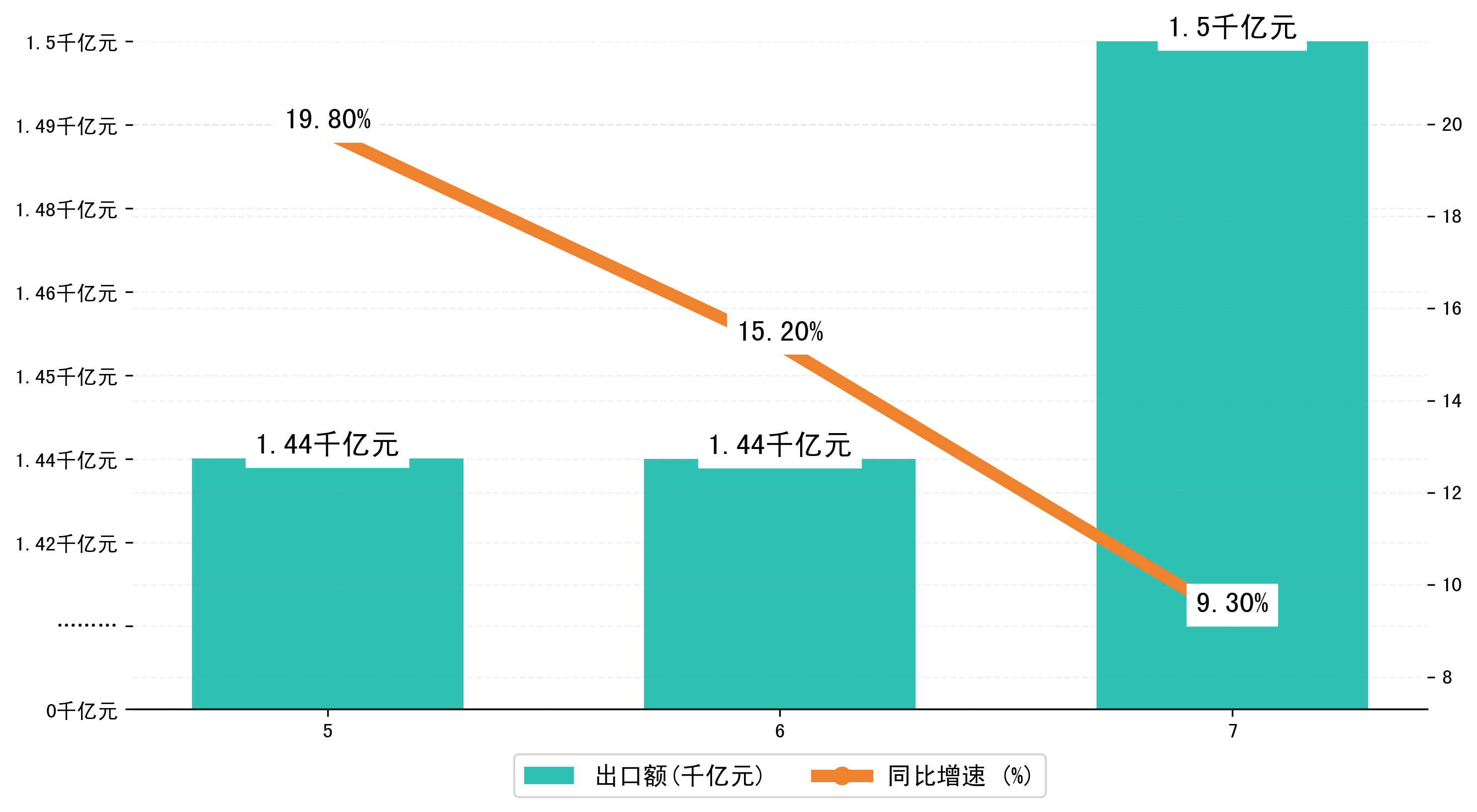 以人民币计,2023年1-7月上海市出口额为9958,9996.5549万元,相比上年同期增加了828,8568.1903万元,同比增加了9.30%。