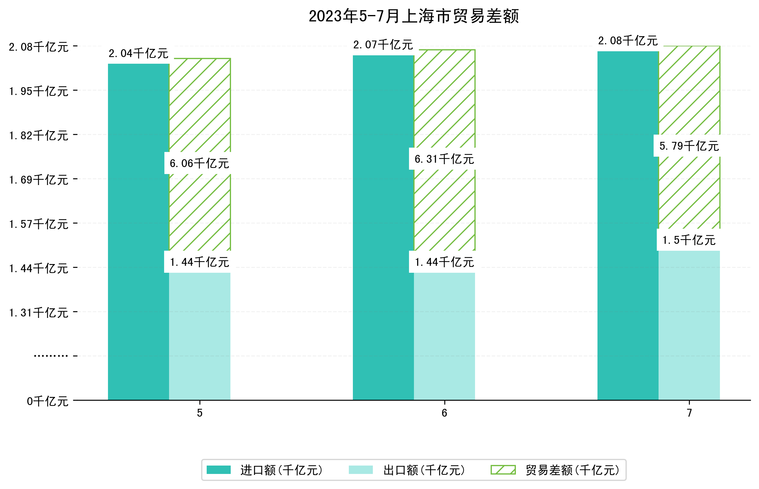 以人民币计,2023年7月上海市贸易差额为578,5089,4501万元(贸易逆差),相比上月增加了52,6397,8357万元,即9,2915,2112万美元;相比上年同期减少了43,3553,8266万元,同比减少8.1%。