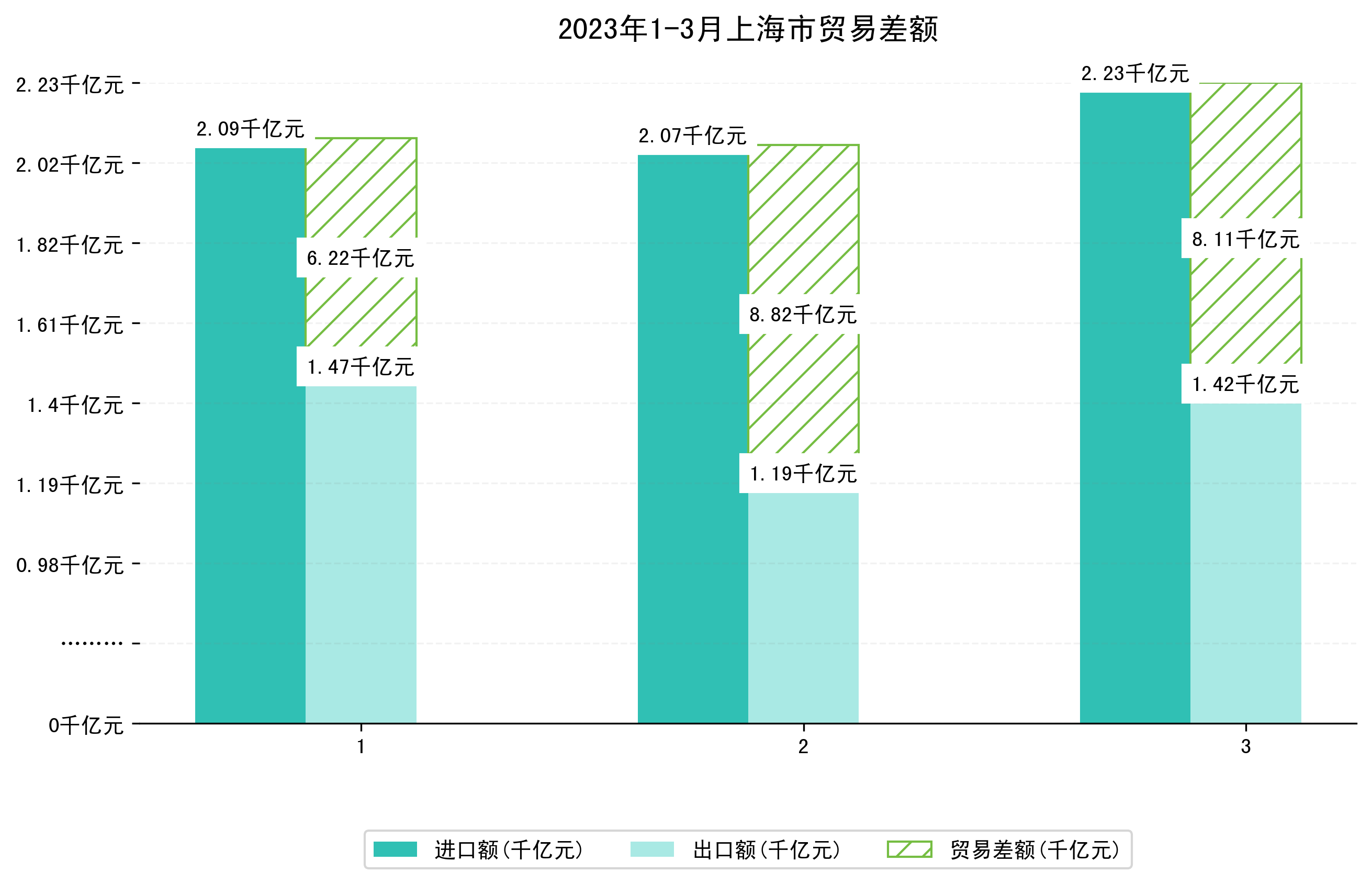 以人民币计,2023年1-3月上海市贸易差额为2315,4081,9384万元(贸易逆差),相比上年同期减少了507,0763,0763万元,同比减少28.04%。