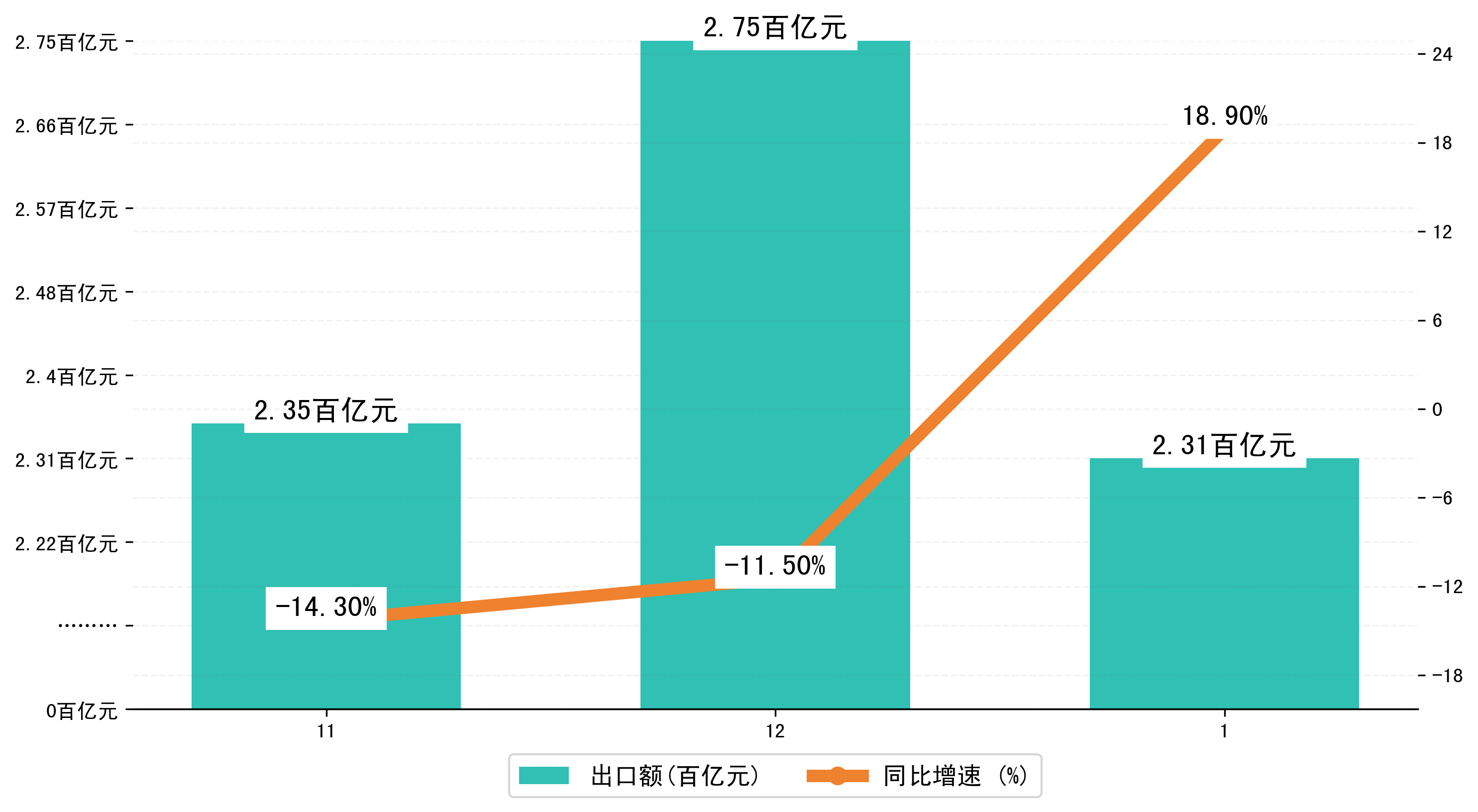以人民币计,2024年1-1月陕西省出口额为230,9198.5787万元,相比上年同期增加了36,6425.2575万元,同比增加了18.90%。