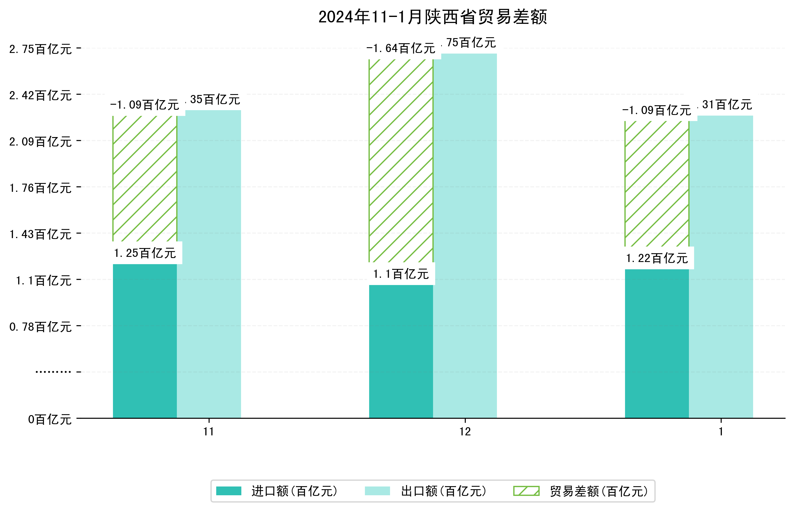 以人民币计,2024年1-1月陕西省贸易差额为109,2879,9654万元(贸易顺差),相比上年同期增加了27,6758,6888万元,同比增加33.91%。