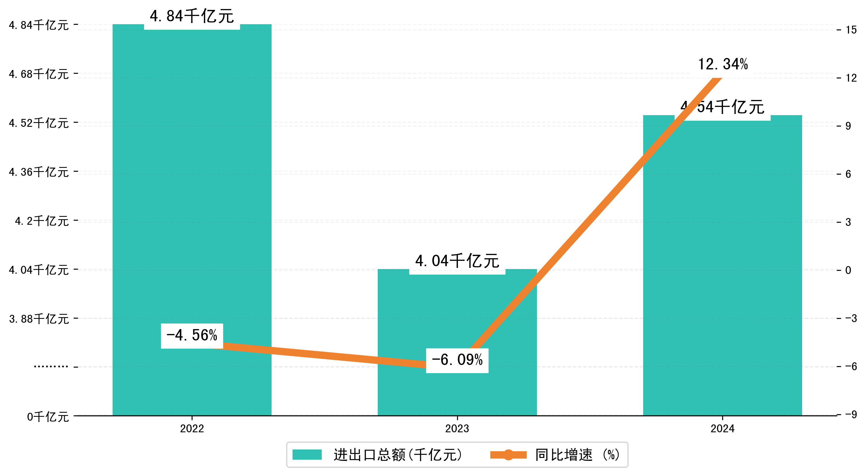 以人民币计,2024年1-12月陕西省进出口总额为4540,7434.4289万元,相比上年同期增加了498,6856.8293万元,同比增加了12.30%。