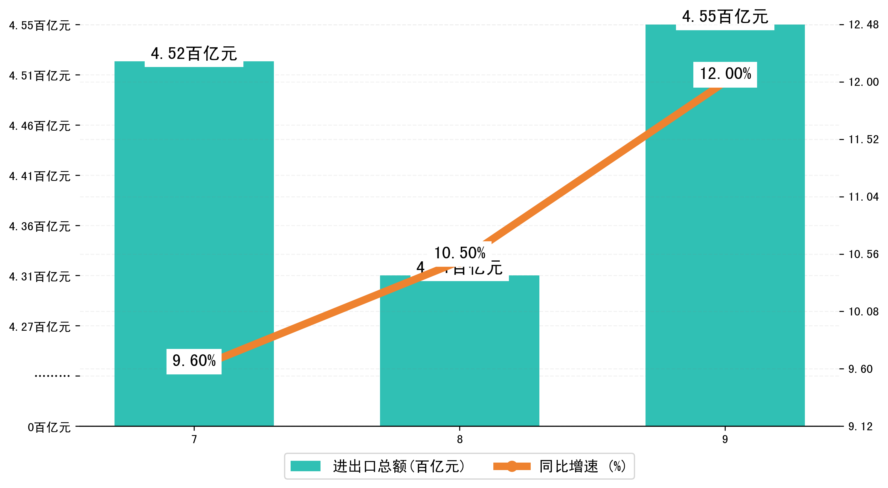 以人民币计,2025年9月陕西省进出口总额为455,4093.5133万元,相比上月增加了23,9337.6879万元;相比上年同期增加了88,6180.628万元,同比增加了12.00%。