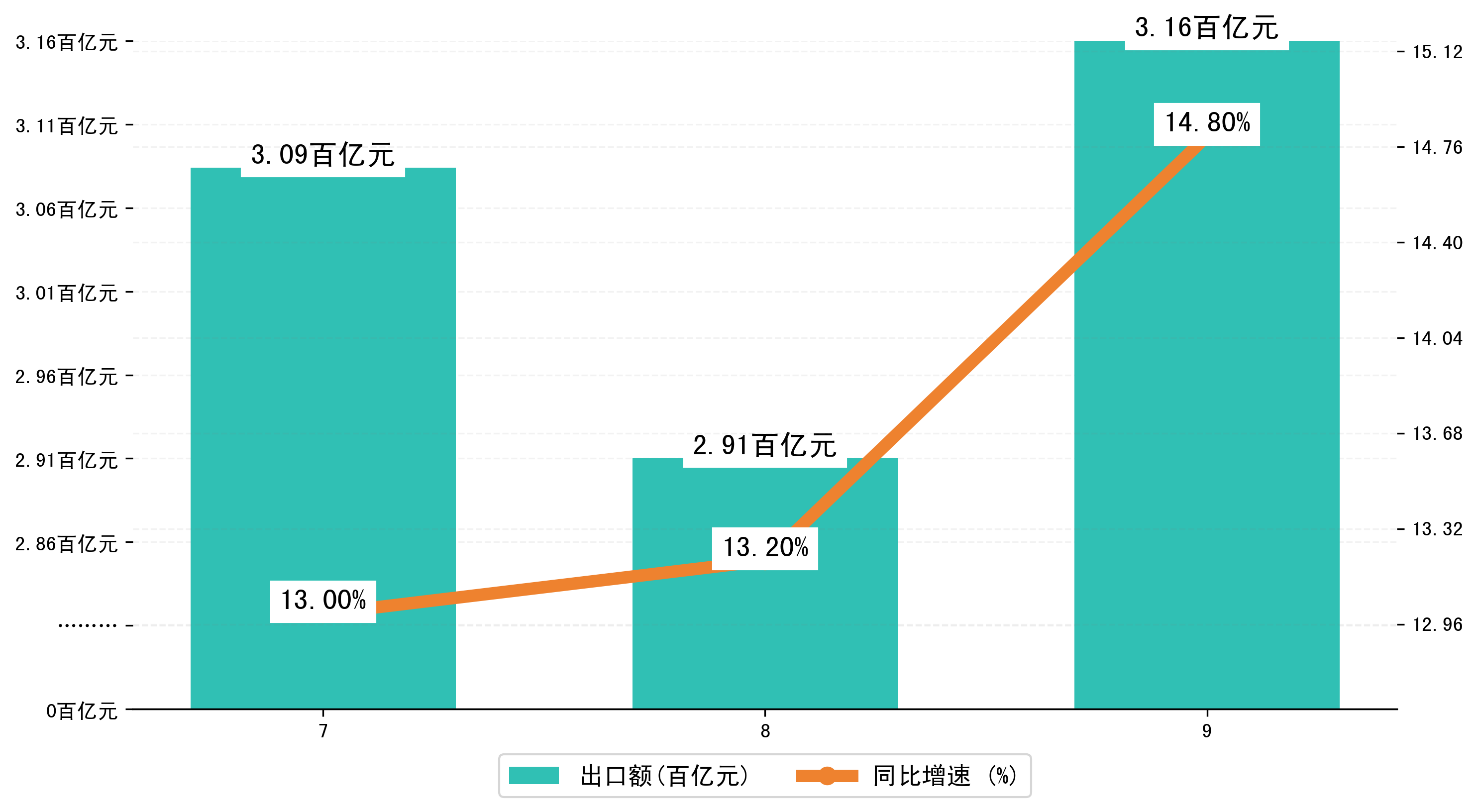 以人民币计,2025年9月陕西省出口额为316,3623.2841万元,相比上月增加了25,7042.7994万元;相比上年同期增加了67,9807.9803万元,同比增加了14.80%。